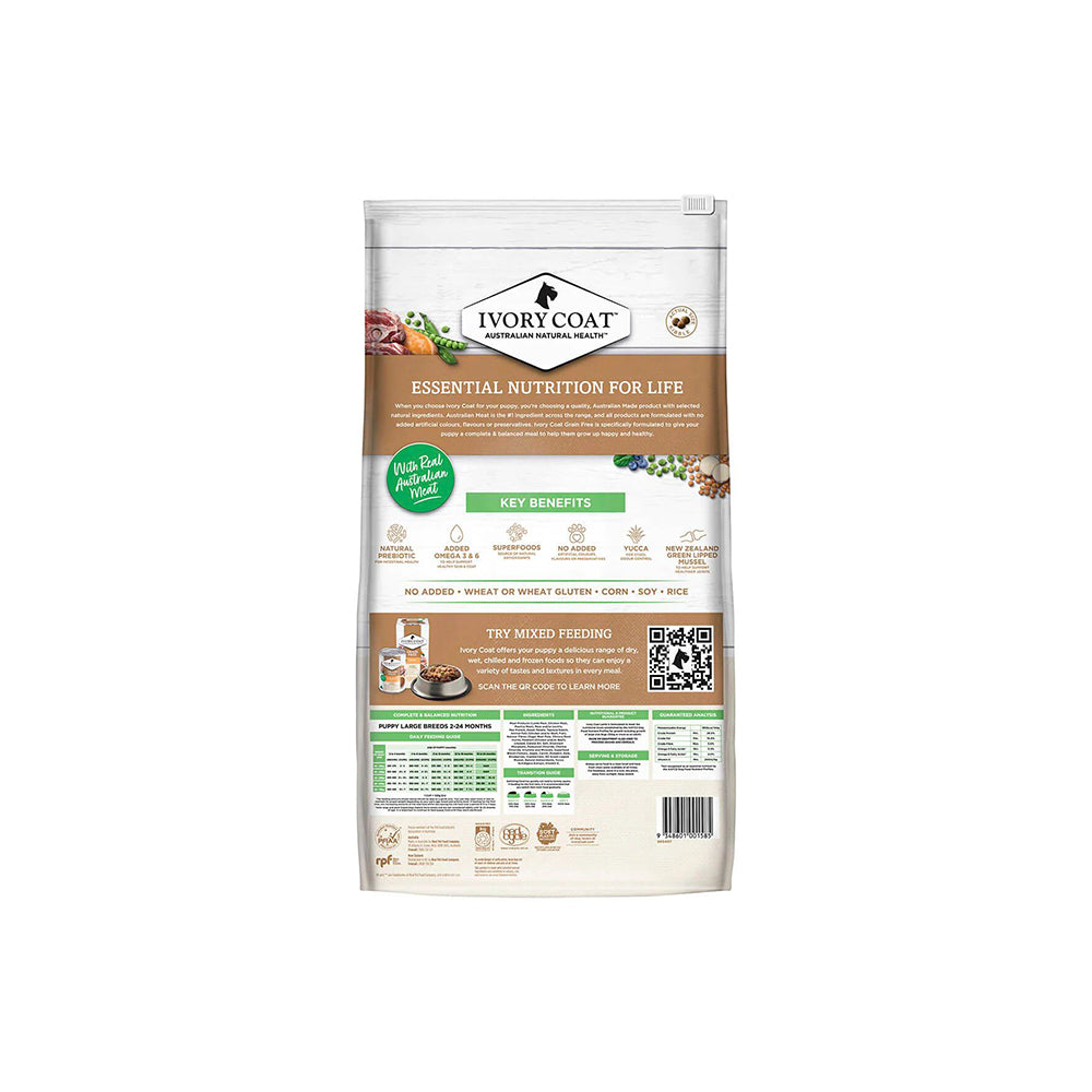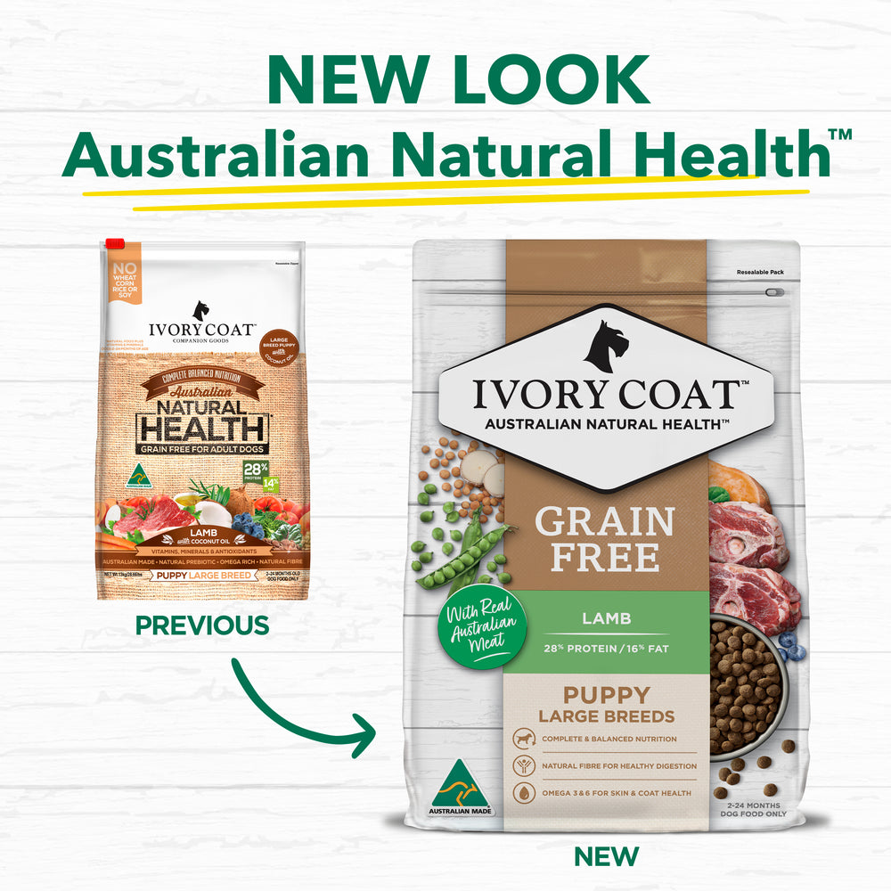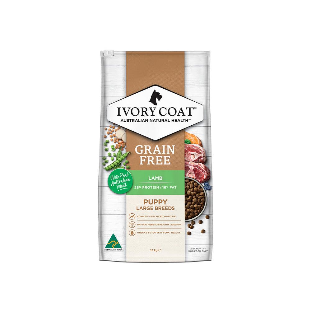 IVORY COAT Lamb and Coconut Oil Grain Free Dog Food for Large Breed Puppies 13kg aids in the prevention of anaemia. It contains precious, essential nutrients for your dog's health like vitamin B12 which gives them enough strength to cope with daily activities. Lamb contains B12 maintaining a sufficient amount of red blood cells in your dog’s body will help oxygen and nutrients throughout its body function well while Coconut Oil fights harmful bacteria and fungi that result in shiny and healthy skin & coat!