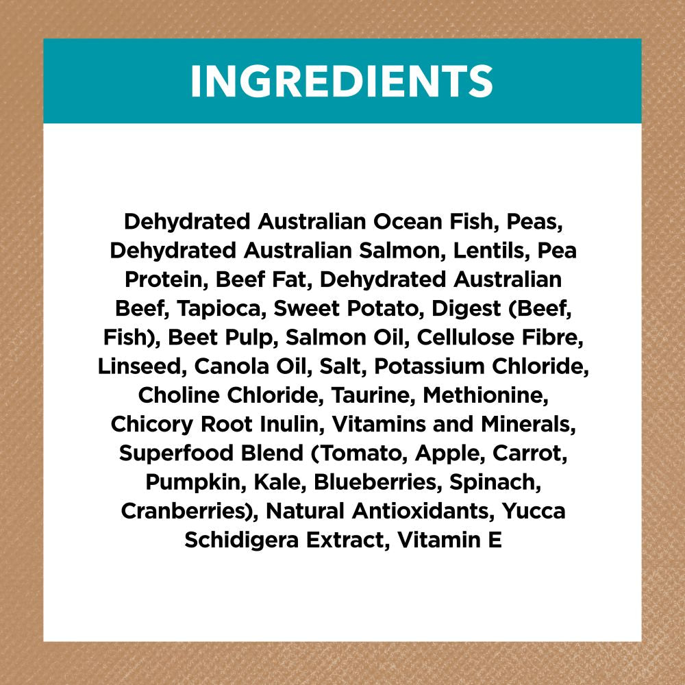 Dehydrated Australian Ocean Fish, Peas, Dehydrated Australian Salmon, Lentils, Pea Protein, Beef Fat, Dehydrated Australian Beef, Tapioca, Sweet Potato, Digest (Beef, Fish), Beet Pulp, Salmon Oil, Cellulose Fibre, Linseed, Canola Oil, Salt, Potassium Chloride, Choline Chloride, Taurine, Methionine, Chicory Root Inulin, Vitamins and Minerals, Superfood Blend (Tomato, Apple, Carrot, Pumpkin, Kale, Blueberries, Spinach, Cranberries), Natural Antioxidants, Yucca Schidigera Extract, Vitamin E.