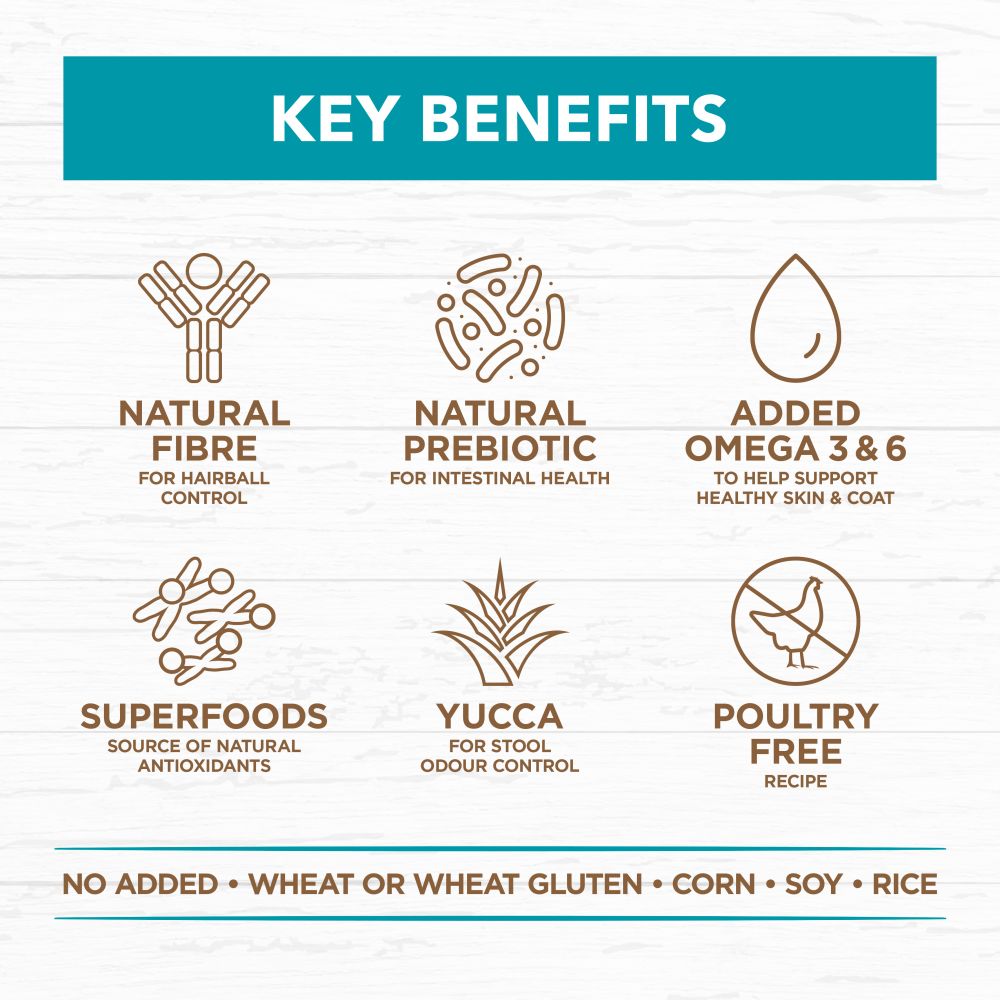 - Use of carefully selected ingredients to provide natural sources of grain-free complex carbohydrates and fibre to help support a healthy gut.