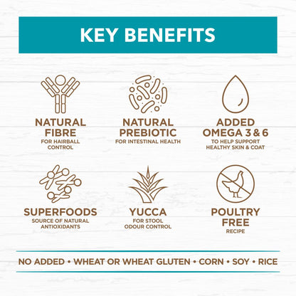 - Use of carefully selected ingredients to provide natural sources of grain-free complex carbohydrates and fibre to help support a healthy gut.