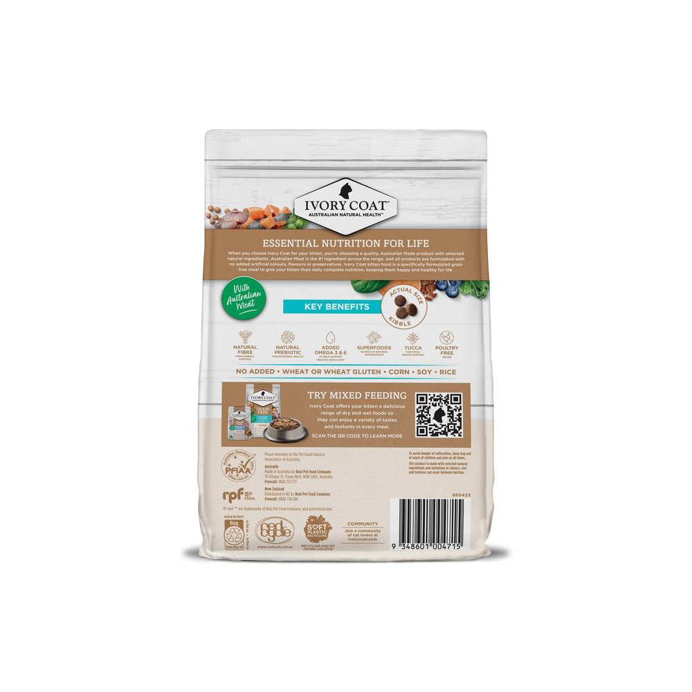 When you choose Ivory Coat for your kitten, you’re choosing quality, Australian Made products with selected natural ingredients. Australian Meat is the #1 ingredient across the range, and all products are formulated with no added artificial colours or flavours. Ivory Coat kitten food is a specifically formulated grain-free meal to give your kitten their daily complete nutrition, helping them grow up happy and healthy.
