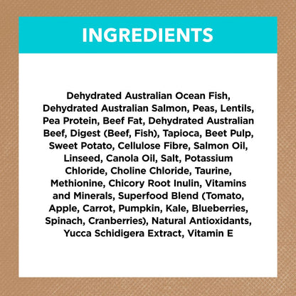 Dehydrated Australian Ocean Fish, Dehydrated Australian Salmon, Peas, Lentils, Pea Protein, Beef Fat, Dehydrated Australian Beef, Digest (Beef, Fish), Tapioca, Beet Pulp, Sweet Potato, Cellulose Fibre, Salmon Oil, Linseed, Canola Oil, Salt, Potassium Chloride, Choline Chloride, Taurine, Methionine, Chicory Root Inulin, Vitamins and Minerals, Superfood Blend (Tomato, Apple, Carrot, Pumpkin, Kale, Blueberries, Spinach, Cranberries), Natural Antioxidants, Yucca Schidigera Extract, Vitamin E.