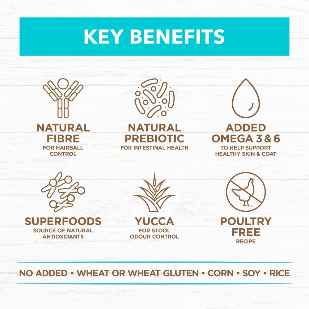 - Use carefully selected ingredients to provide natural sources of grain-free complex carbohydrates and fibre to help support a healthy gut.