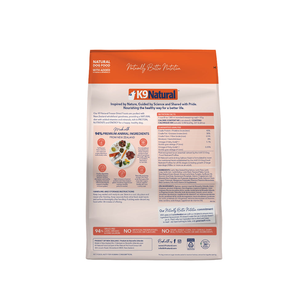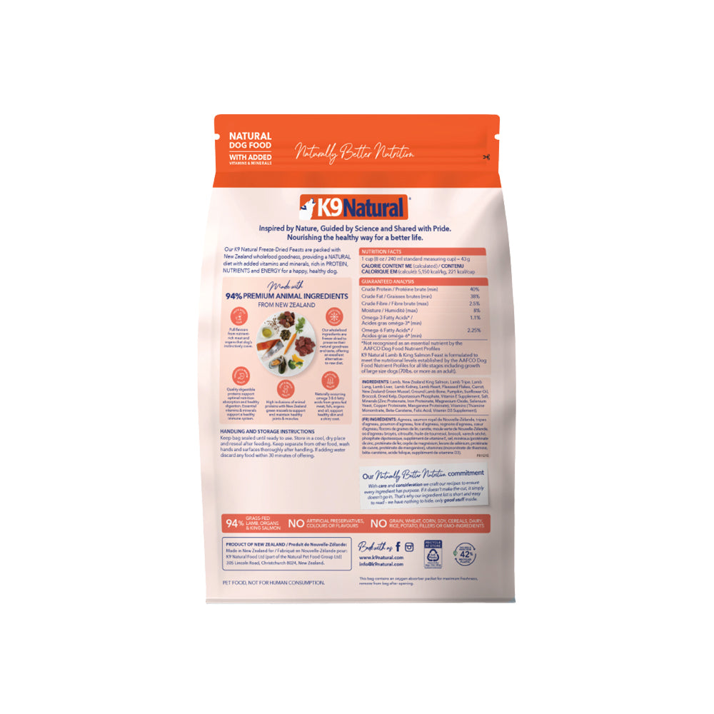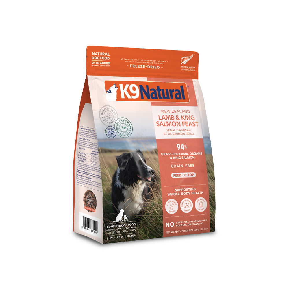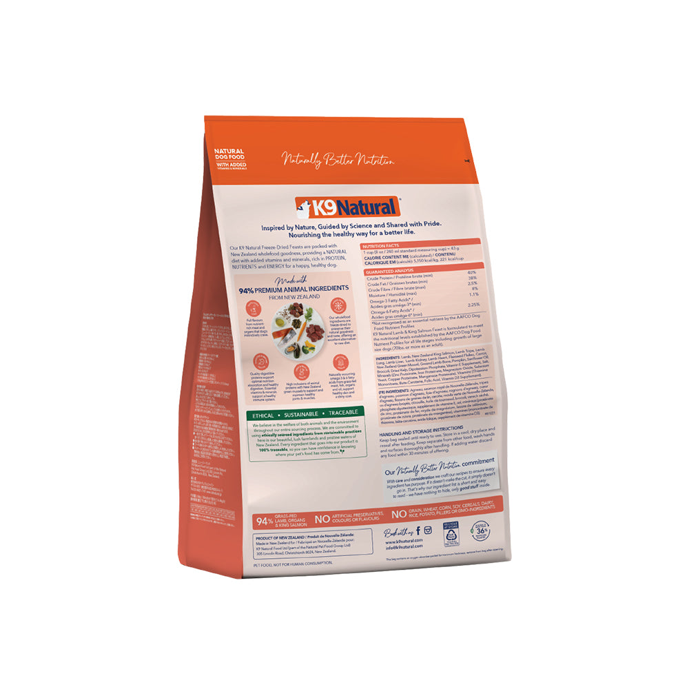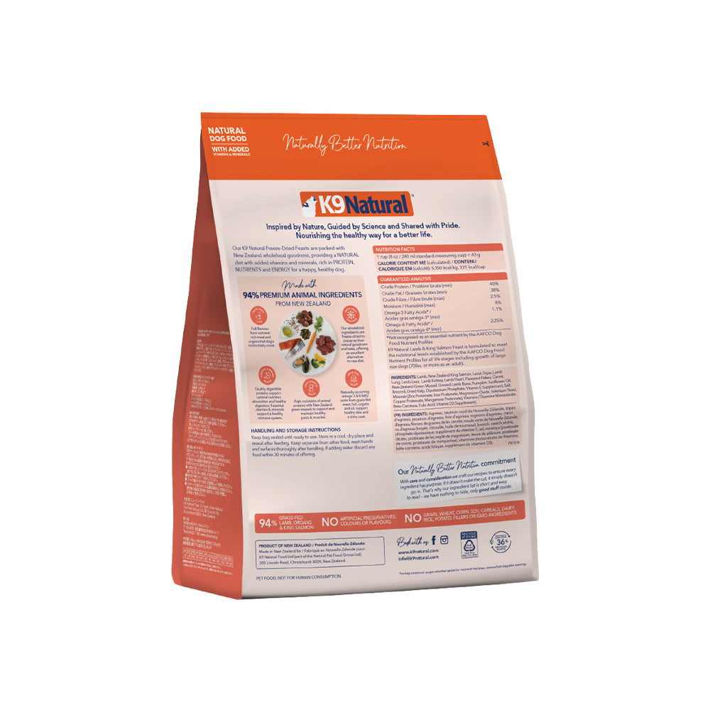 K9 NATURAL Lamb & King Salmon Freeze Dried Dog Food 500g is an innovative, high-quality all-natural product that uses human-grade ingredients to create an exciting meal your dog is sure to love! Made with healthy meats and no grains or fillers, they experience the purest diet that only contains the tastiest of ingredients. Freeze-dried means that they can enjoy a complete and balanced meal with optimal nutrients in order to keep them active, happy, and living their best lives!