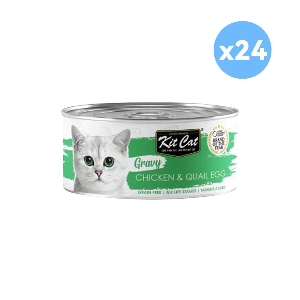 KIT CAT Chicken & Quail in Gravy Cat Food 70g wet food is made with the goodness of carefully selected natural ingredients, containing no added colours or preservatives. Our 100% grain-free diet offers your cat a pH level balance wholesome nutrition to support a healthy lifestyle, reducing the risk of kidney stones and urinary tract infection. With selected quality deboned meat containing essential vitamins, our Kit Cat formula also has an optimal ratio of omega-3 to omega-6 fatty acids that promotes a healthy heart, skin and coat for your cats.