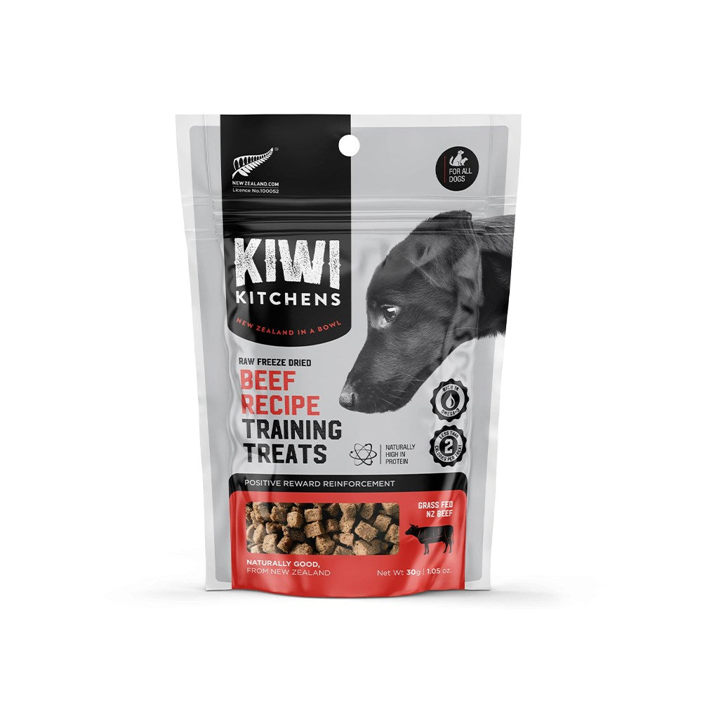 Made with New Zealand grass-fed beef and organ meats, KIWI KITCHENS Freeze Dried Beef Training Dog Treats 30g offer a protein-rich reward that supports muscle development and overall health. With natural richness in vitamins and low-calorie content, they are an ideal choice for training dogs of all breeds and ages.