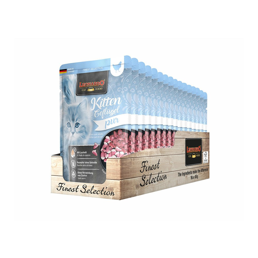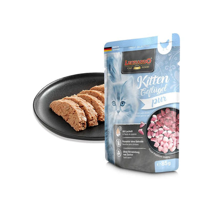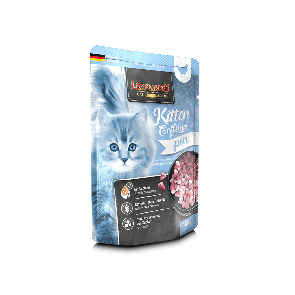 Poultry meat combined with nutrient-rich offal – this recipe specially tailored for little gourmets is easily digestible and offers everything a kitten needs to start life optimally and happily. And it also ensures a glossy coat: LEONARDO Kitten Poultry Pure contains salmon oil, providing polyunsaturated fatty acids.