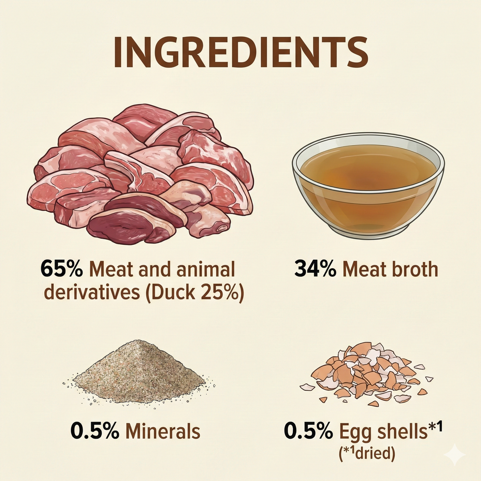 Meat and animal derivatives (Duck 25%) (65%); Meat broth (34%); Minerals (0.5%); Egg shells*¹ (0.5%) *¹dried