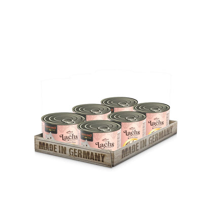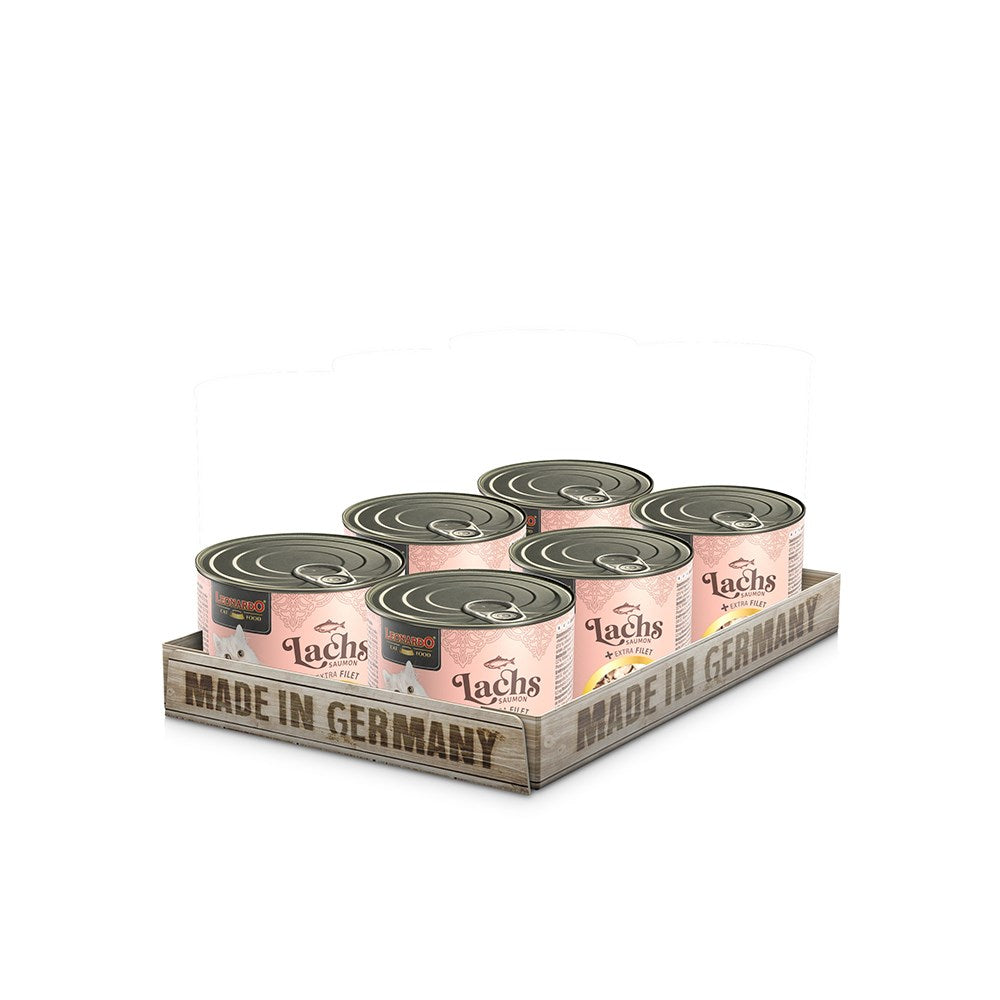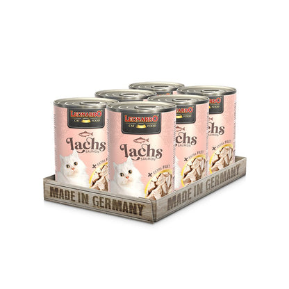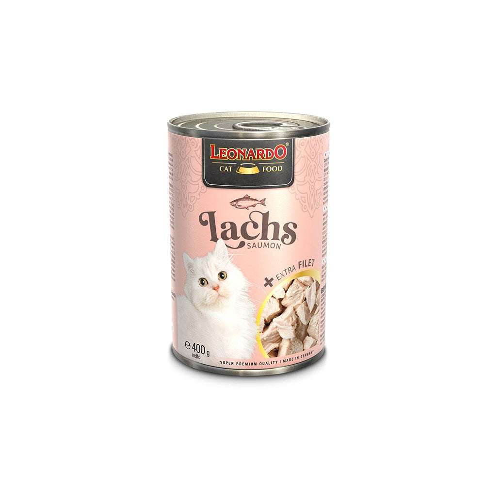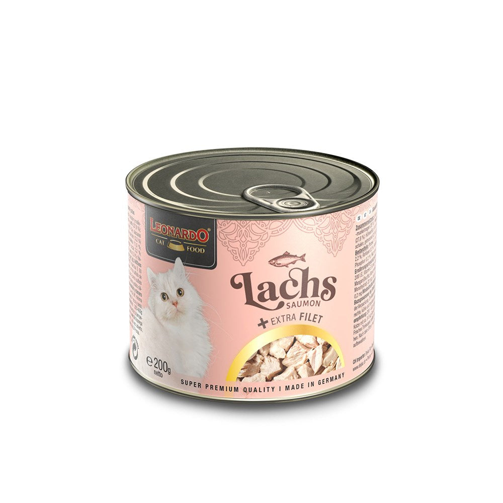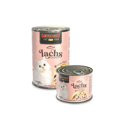 LEONARDO Salmon + Extra Fillet Wet Cat Food's delicious fillet menu for all fish lovers. Juicy salmon is enriched with chicken and extra delicious fillet pieces. Gently cooked in its own juices, the meat becomes an irresistible chewy treat. Salmon oil gives the recipes the final touch and provides fatty acids for a particularly silky coat. Of course, made without sugar or artificial colourings, flavours and preservatives.
