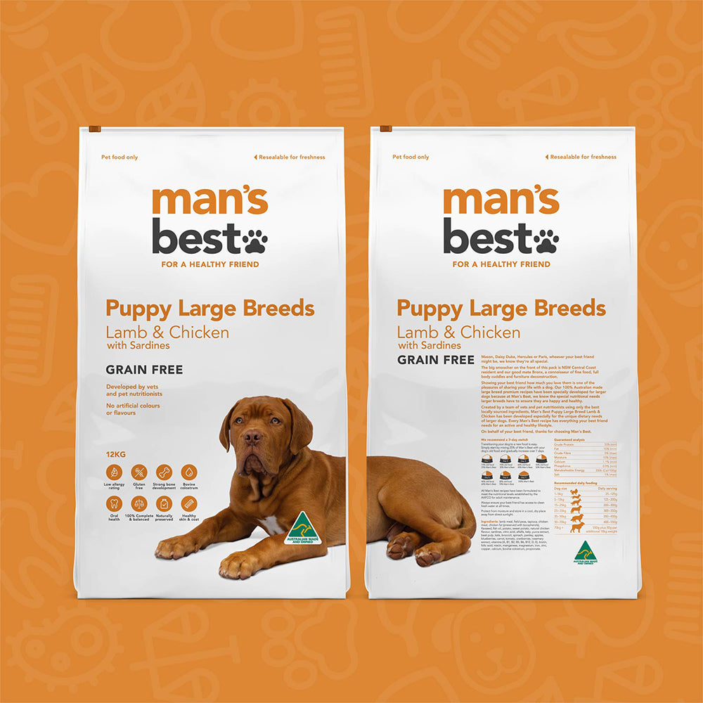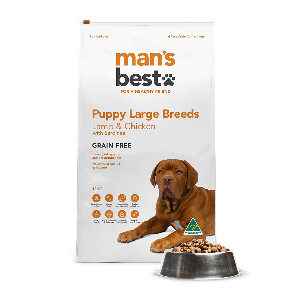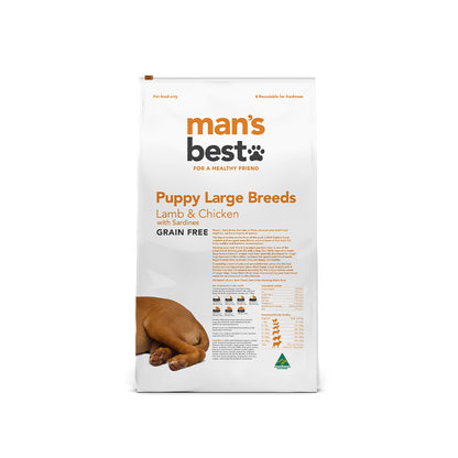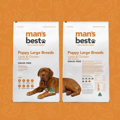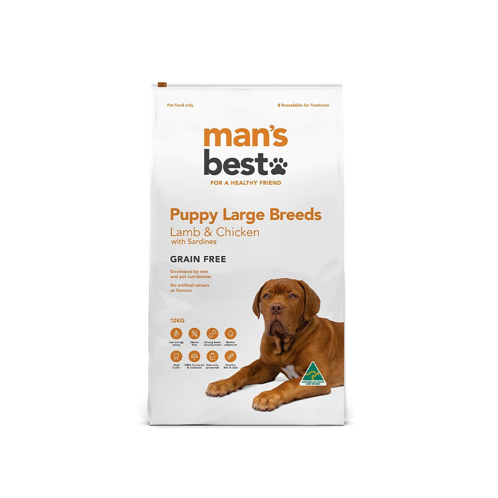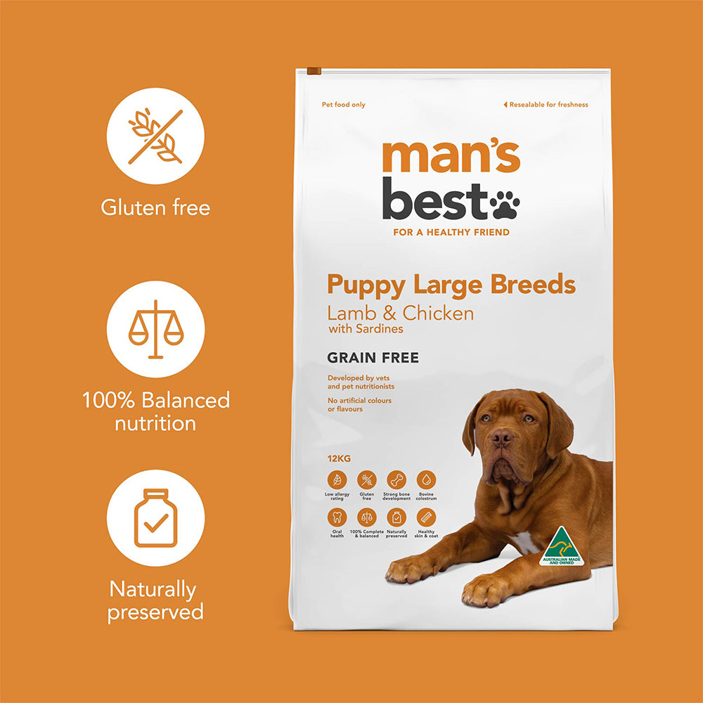 Introduce your large breed puppy to a nutritious start with MAN'S BEST Large Breeds Lamb & Chicken Puppy Dog Food. Developed by vets and pet nutritionists, this 100% Australian-made, grain-free formula, featuring bovine colostrum, is specially crafted to meet the unique nutritional needs of large breeds puppy like Labrador Retriever, Golden Retriever, Boxer, German Shepherd, Saint Bernard, English Mastiff, and Great Dane.
