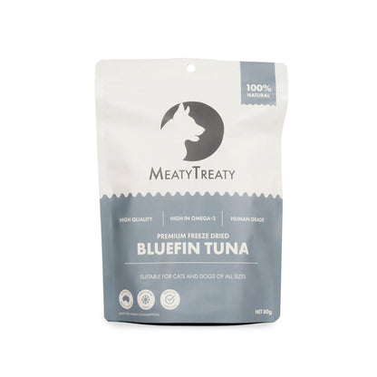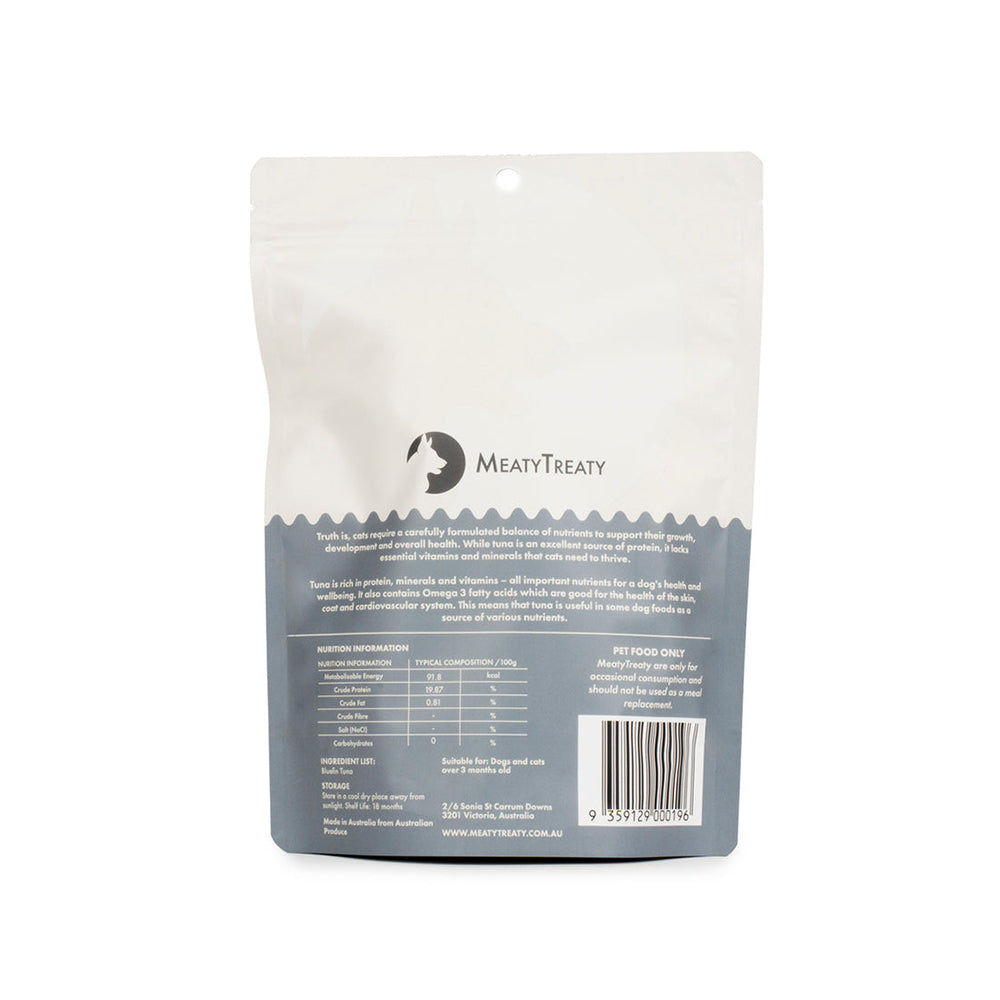 MEATY TREATY Freeze Dried Bluefin Tuna Pet Treats provide a rich source of protein, minerals, and vitamins, making them a great snack for both cats and dogs. While tuna is not a complete source of all the essential nutrients that cats need, it is an excellent addition to their diet, offering a tasty and healthy treat. Packed with Omega-3 fatty acids, tuna supports skin and coat health as well as cardiovascular function. These freeze-dried treats are an excellent way to boost your pet's nutritional intake, offering both flavor and health benefits in one convenient snack. Perfect for both cats and dogs looking to enjoy a nutritious and delicious treat!