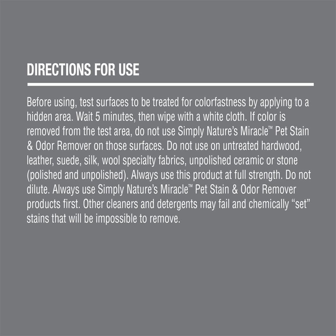removed from the test area, do not use Simply Nature's Miracle Pet Stain & Odor Remover on those surfaces. Do not use on untreated hardwood,leather, suede, silk, wool specialty fabrics, unpolished ceramic or stone (polished and unpolished). Always use this product at full strength. Do not dilute. Always use Simply Nature's Miracle Pet Stain & Odor Remover