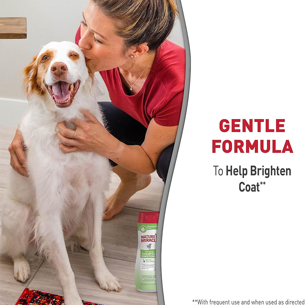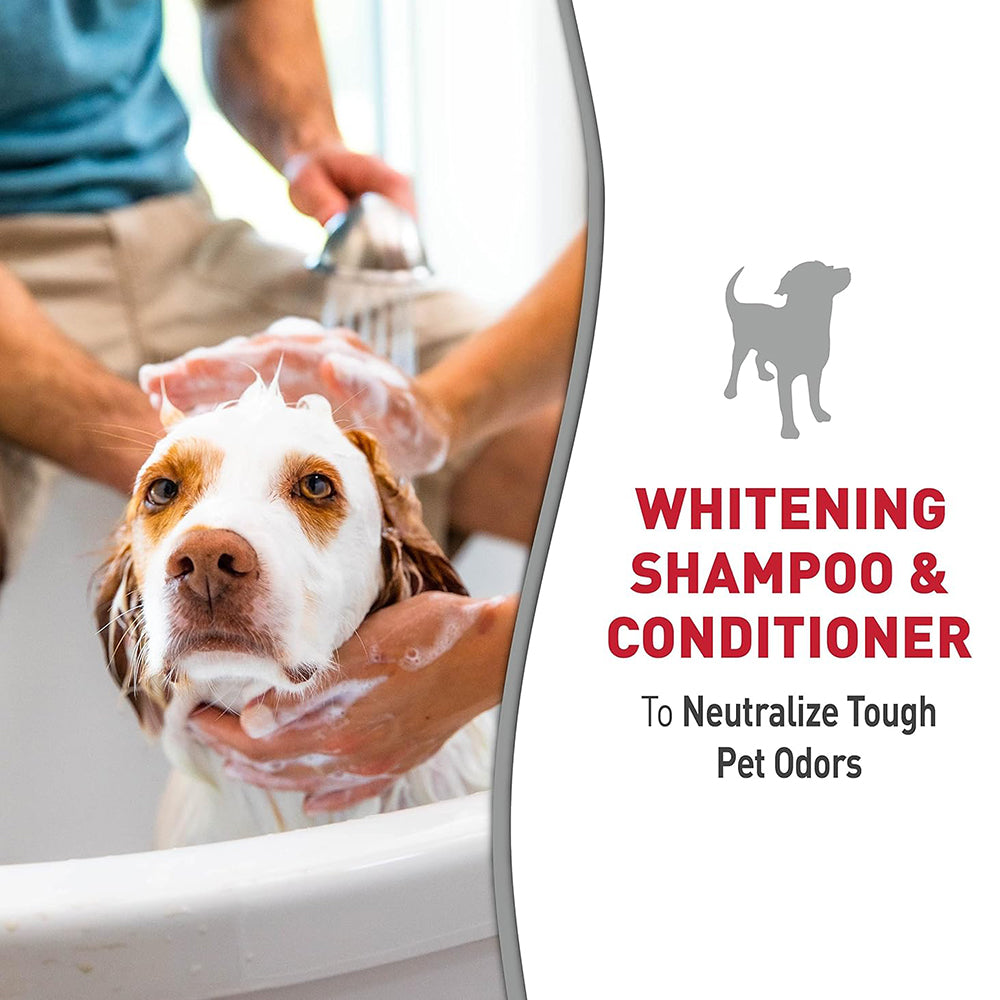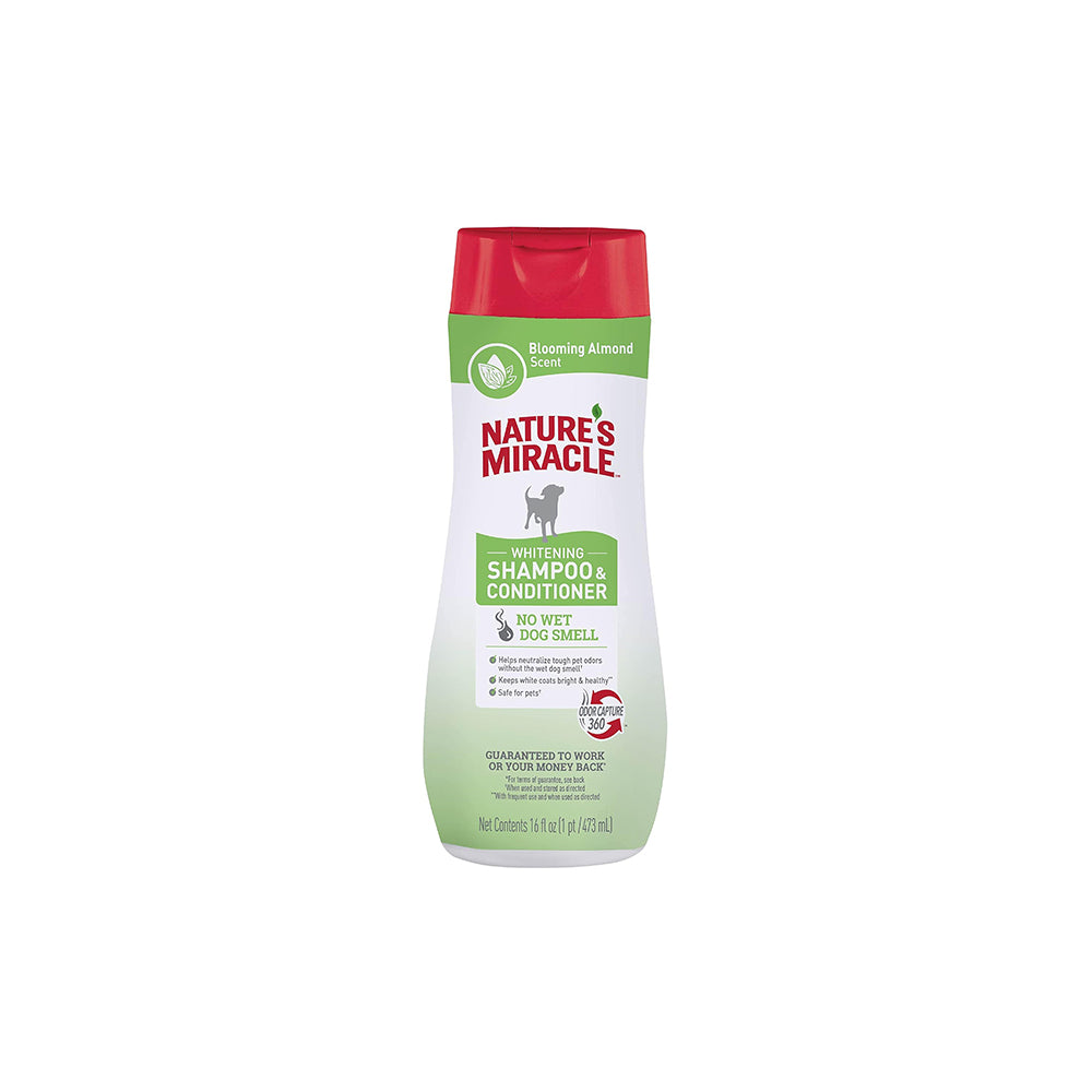 When strong dog odors start to crinkle your nose, it’s time for Nature’s Miracle™ Whitening Shampoo and Conditioner! The reformulated shampoo and conditioner helps neutralize odors and freshens with a light blooming almond scent, without the wet dog smell. This formula keeps white coats bright and healthy with frequent use and when used as directed. This shampoo and conditioner contains calendula extract, aloe vera, Panthenol, keratin, and coconut water.