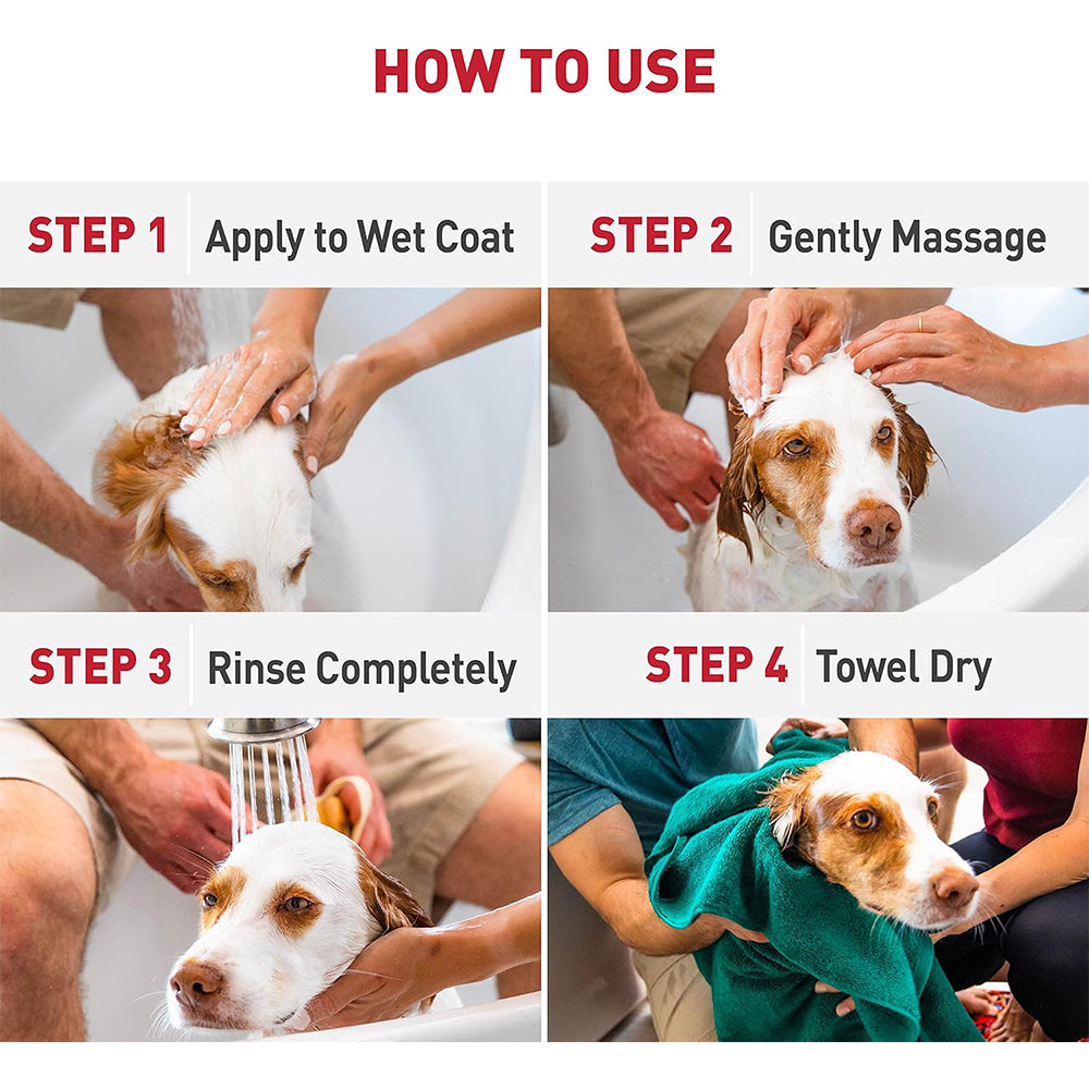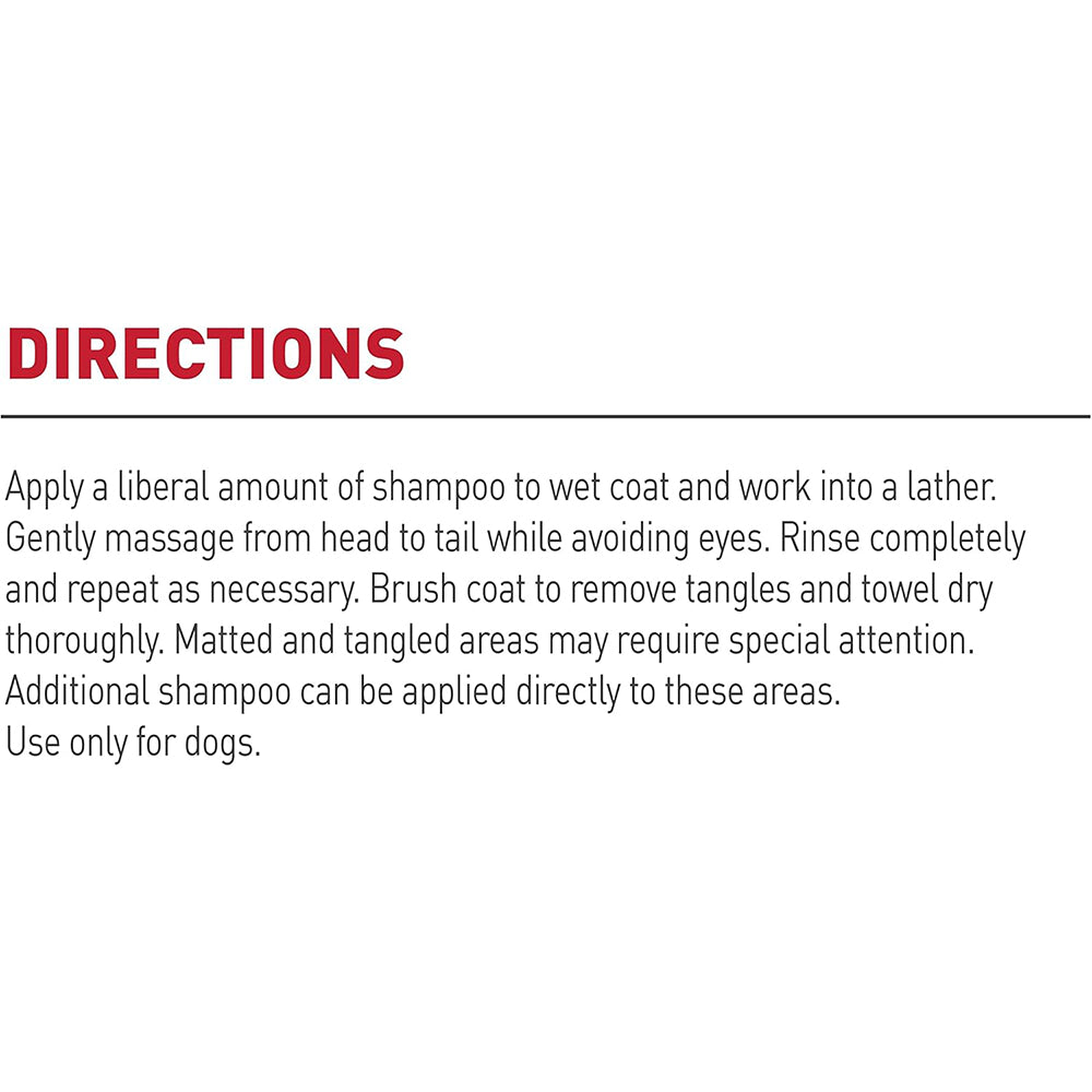 Apply a generous amount of shampoo to a wet coat and work it into a rich lather. Carefully massage from head to tail, being cautious around the eyes. Rinse thoroughly and repeat as needed for stubborn dirt and odors. Brush the coat to eliminate tangles, and towel dry completely. For matted or tangled fur, extra care may be needed, and additional shampoo can be applied directly to these spots. Intended for use on dogs only.