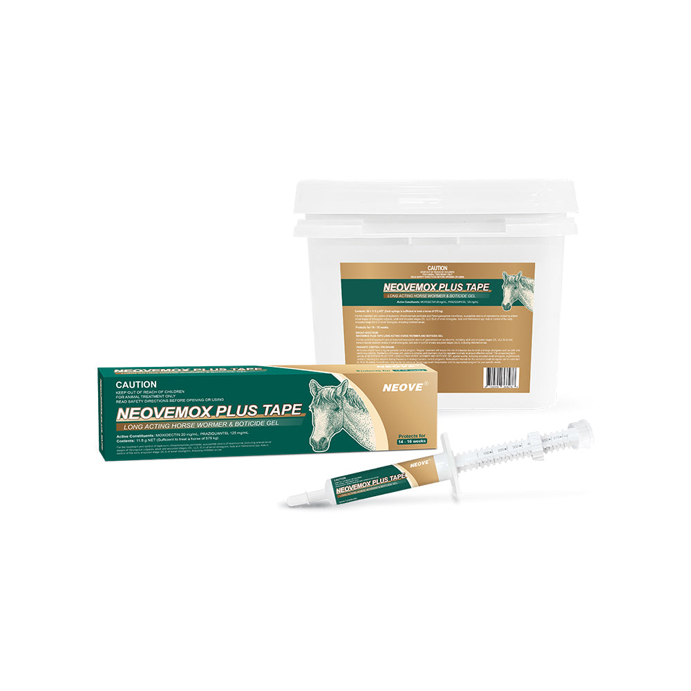 - NEOVEMOX PLUS TAPE LONG ACTING HORSE WORMER BOTICIDE GEL is administered orally (into the mouth) at a dose rate of 0.4 mg/kg moxidectin and 2.5 mg/kg praziquantel.