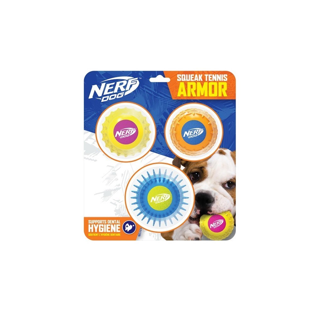 - Fun squeaky tennis balls with added armour for hours of fun! Supports dental hygiene.