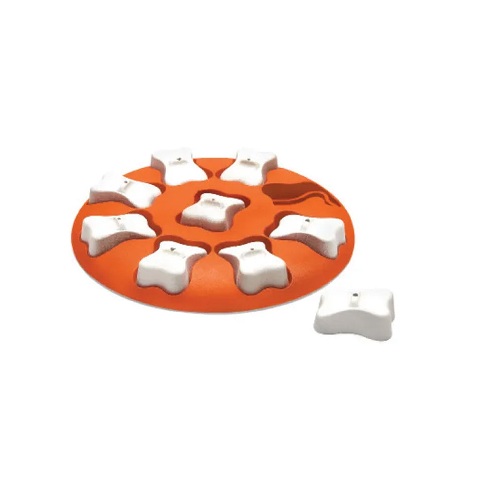 - ENGAGING & MENTALLY STIMULATING:This interactive dog puzzle features 9 hidden compartments that are covered by 9 removable dog bone pieces. Hide your pup's favorite treats in the compartments and elevate the bone for an easier grab or leave them flush with the board for increased difficulty. Watch as your dog learns to nudge and paw away the bones to reveal the reward!