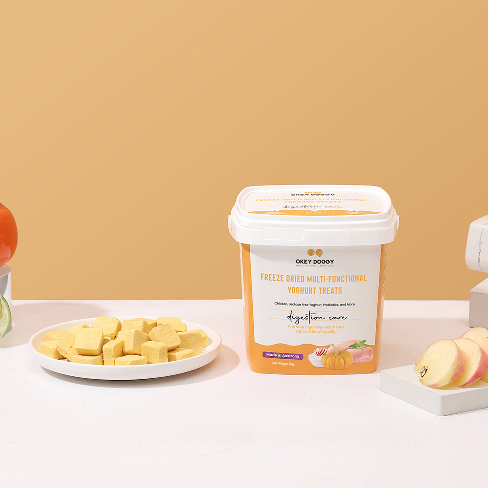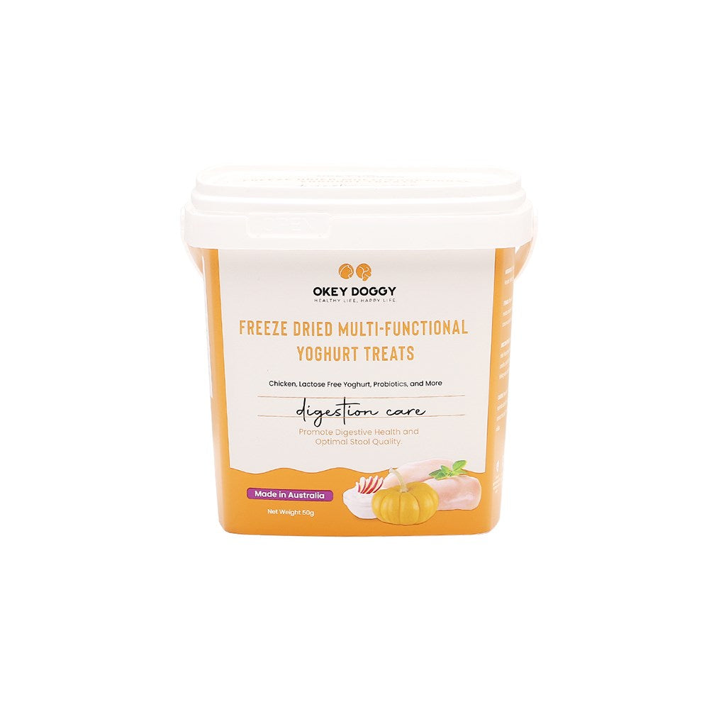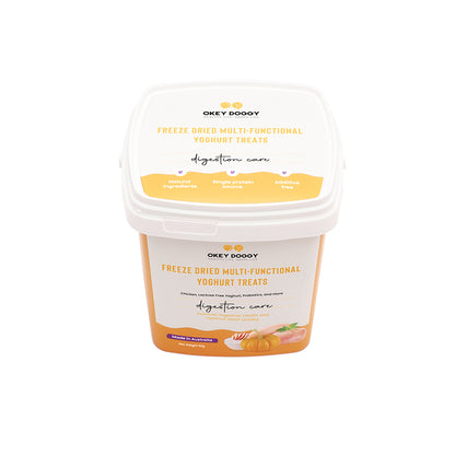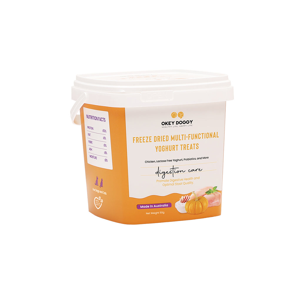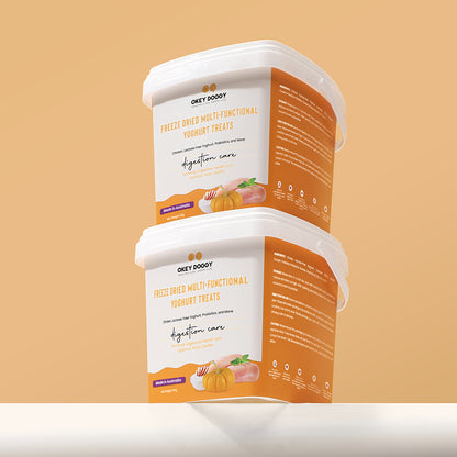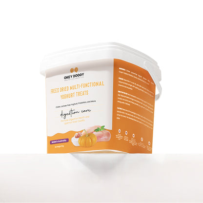 OKEY DOGGY Freeze Dried Digestion Care Multifunctional Yoghurt Pet Treats are specially crafted to support your pet’s digestive health. Each treat combines probiotics and prebiotics to promote a healthy gut. Enriched with apples and pumpkins, they offer essential nutrients from fruits and vegetables for balanced nutrition. Made with a single protein source and lactose-free yogurt, these treats are gentle on the stomach and help reduce allergies. Perfect for pets over 3 months old, they provide a healthy, tasty, and allergy-friendly snack.
