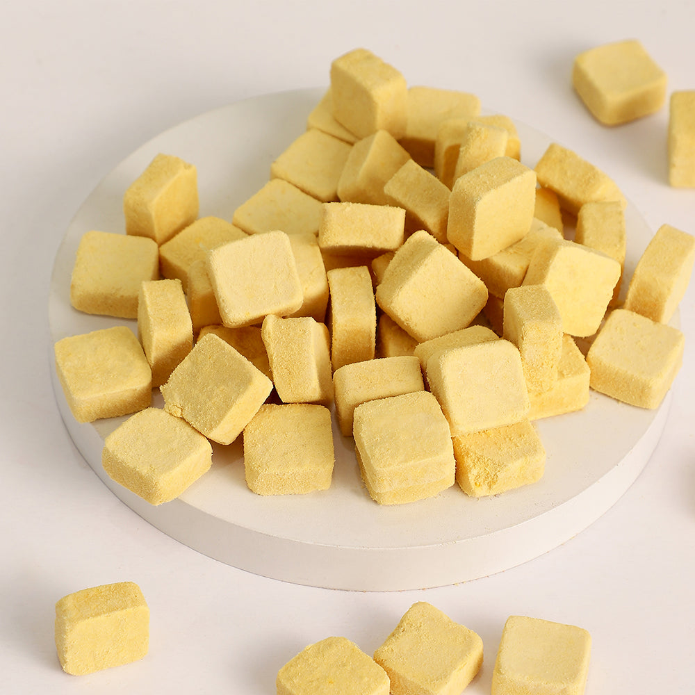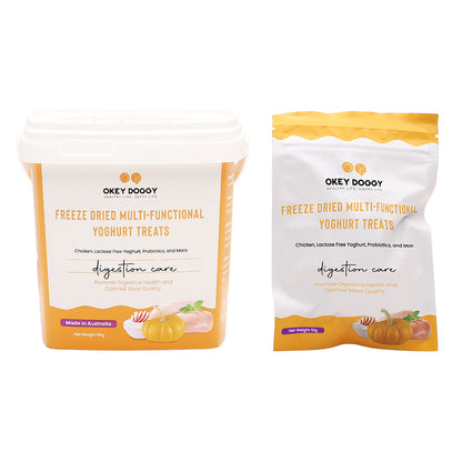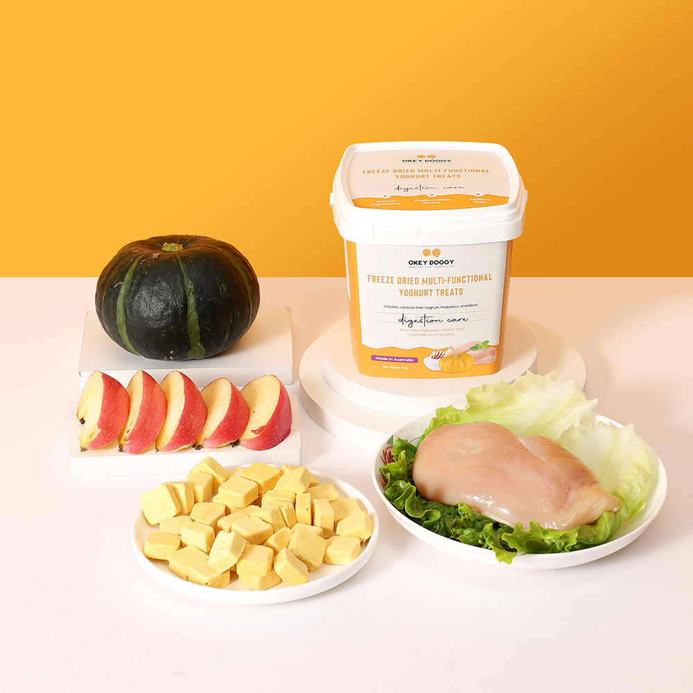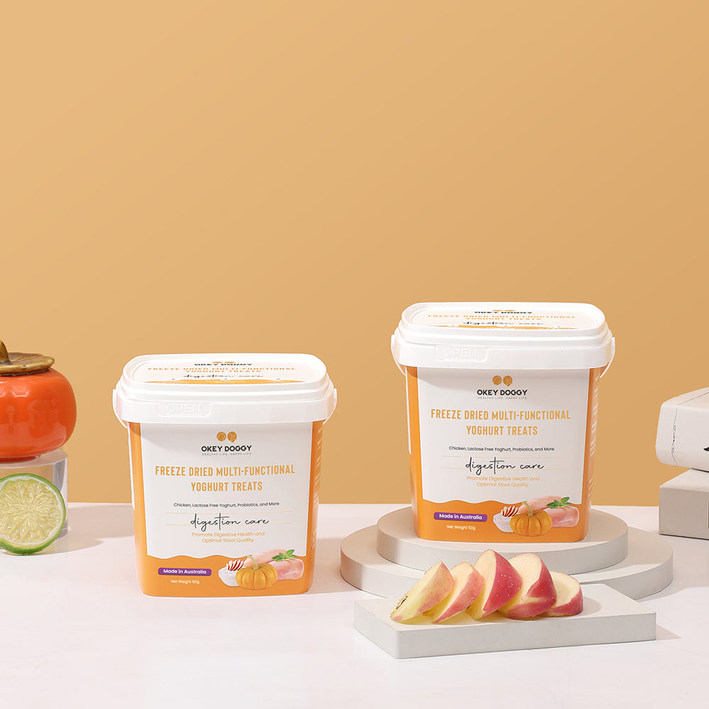 OKEY DOGGY Freeze Dried Digestion Care Multifunctional Yoghurt Pet Treats are specially crafted to support your pet’s digestive health. Each treat combines probiotics and prebiotics to promote a healthy gut. Enriched with apples and pumpkins, they offer essential nutrients from fruits and vegetables for balanced nutrition. Made with a single protein source and lactose-free yogurt, these treats are gentle on the stomach and help reduce allergies. Perfect for pets over 3 months old, they provide a healthy, tasty, and allergy-friendly snack.