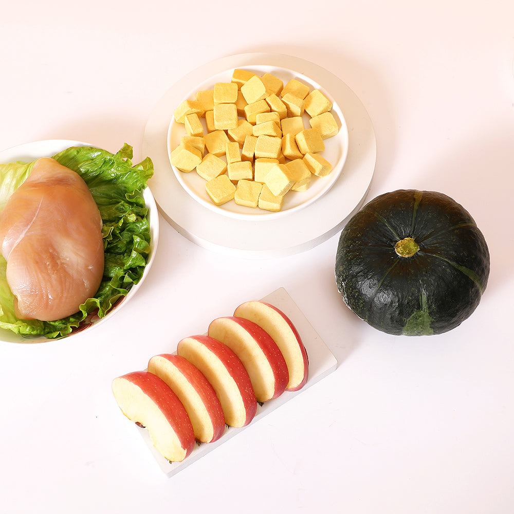 Chicken, Lactose-free Yogurt, Chicken Offal, Apple, Pumpkin, Probiotics, Prebiotics, Taurine, Vitamins B1, B6, D3 and E.