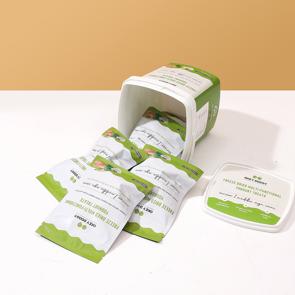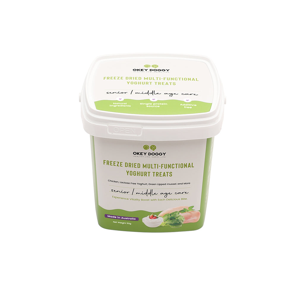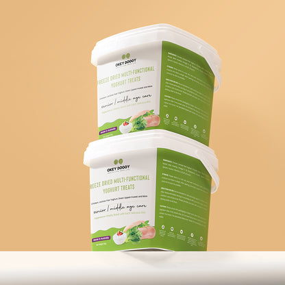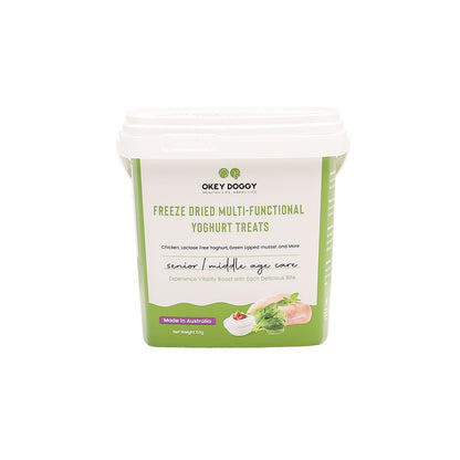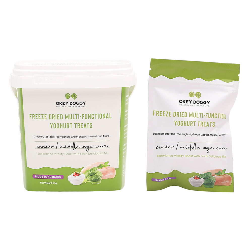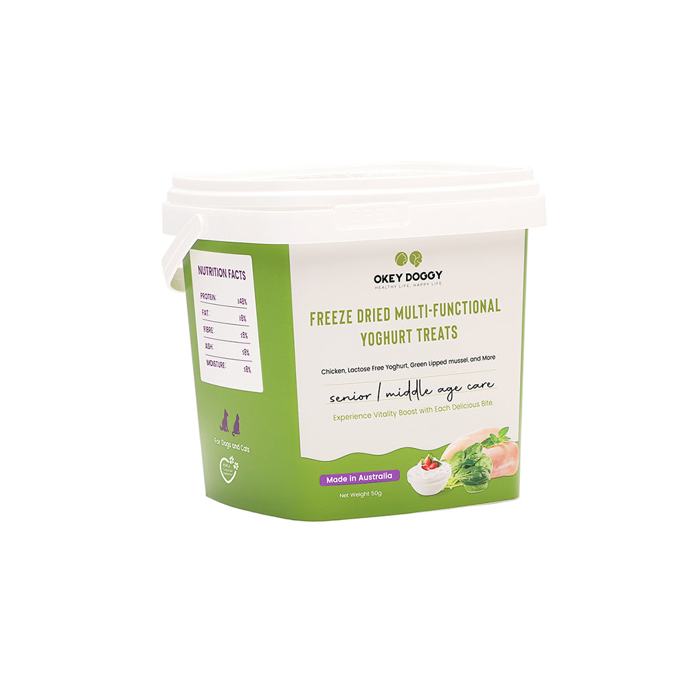 OKEY DOGGY Freeze Dried Senior & Middle Age Care Multifunctional Yoghurt Pet Treats are designed for senior and middle-aged pets to support joint and overall well-being. They contain green-lipped mussels, rich in omega-3s, glucosamine, and chondroitin, which reduce inflammation, improve mobility, and support cartilage repair. Enriched with rosehips, spinach, blueberries, and purple sweet potatoes, they offer balanced nutrition with essential vitamins and minerals. Made with a single protein source and lactose-free yogurt, these treats help minimize allergies, making them a healthy and tasty option for aging pets.