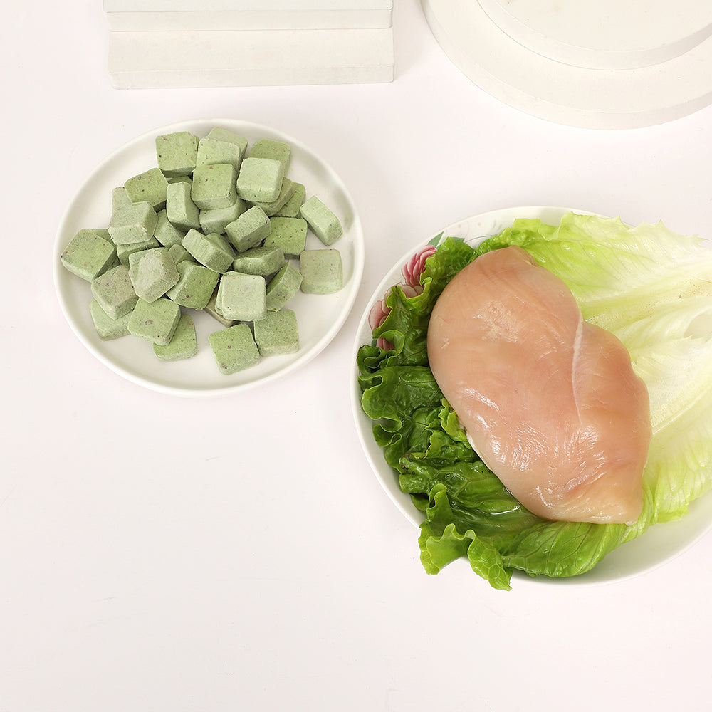 Chicken, Lactose-free Yogurt, Chicken Offal, Green Lipped Mussel, MSM, Rosehip, Omega-3 Oil, Blueberries, Purple Sweet Potato, Spinach, Taurine, Vitamins C, B1, B6, D3 and E.