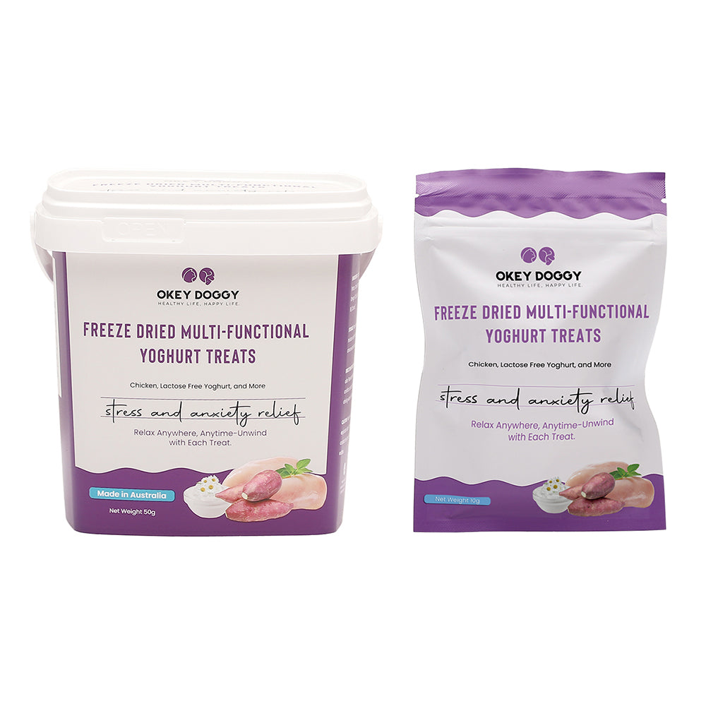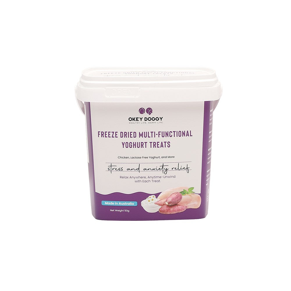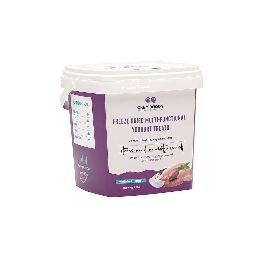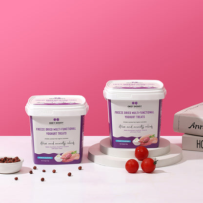 OKEY DOGGY Freeze Dried Stress & Anxiety Relief Multifunctional Yoghurt Pet Treats contain calming ingredients like chamomile, L-tryptophan, and jujube seed oil, which promote relaxation and reduce overreactions. Magnesium helps regulate mood by supporting neurotransmitter balance, while purple sweet potato and carrot provide essential nutrients for overall well-being. With a single protein source and lactose-free yogurt, these treats minimize allergy risks and are suitable for pets over 3 months old. This holistic blend helps pets feel calmer, supporting their mental health and emotional balance.