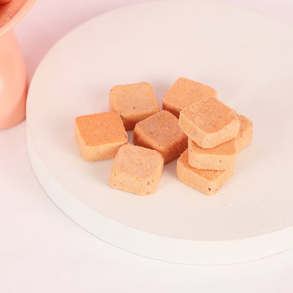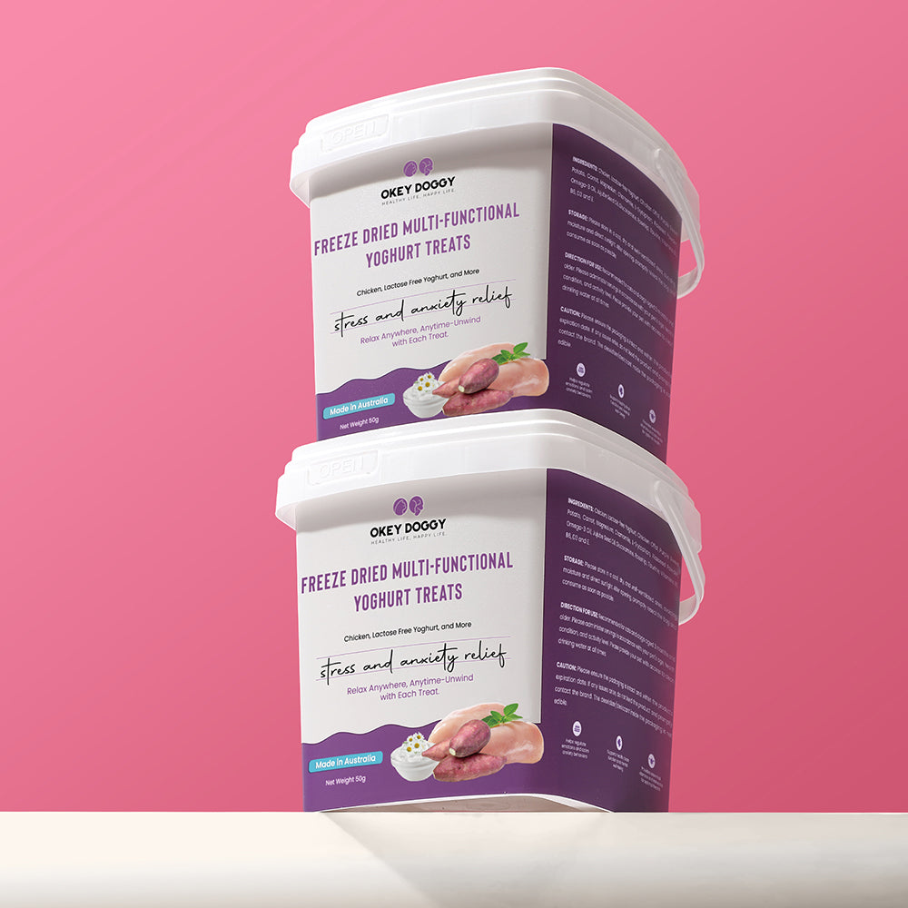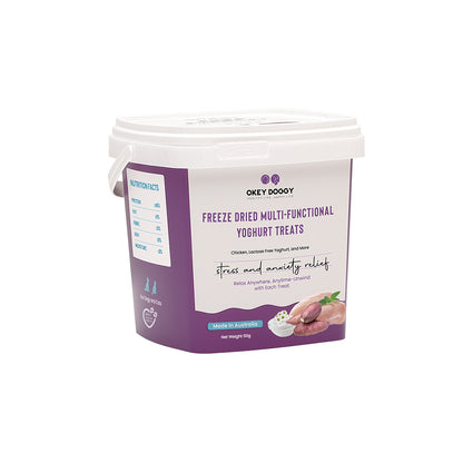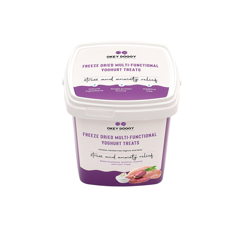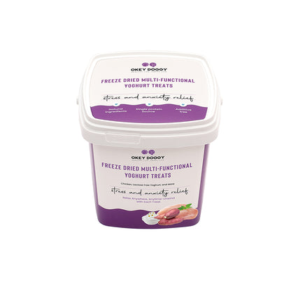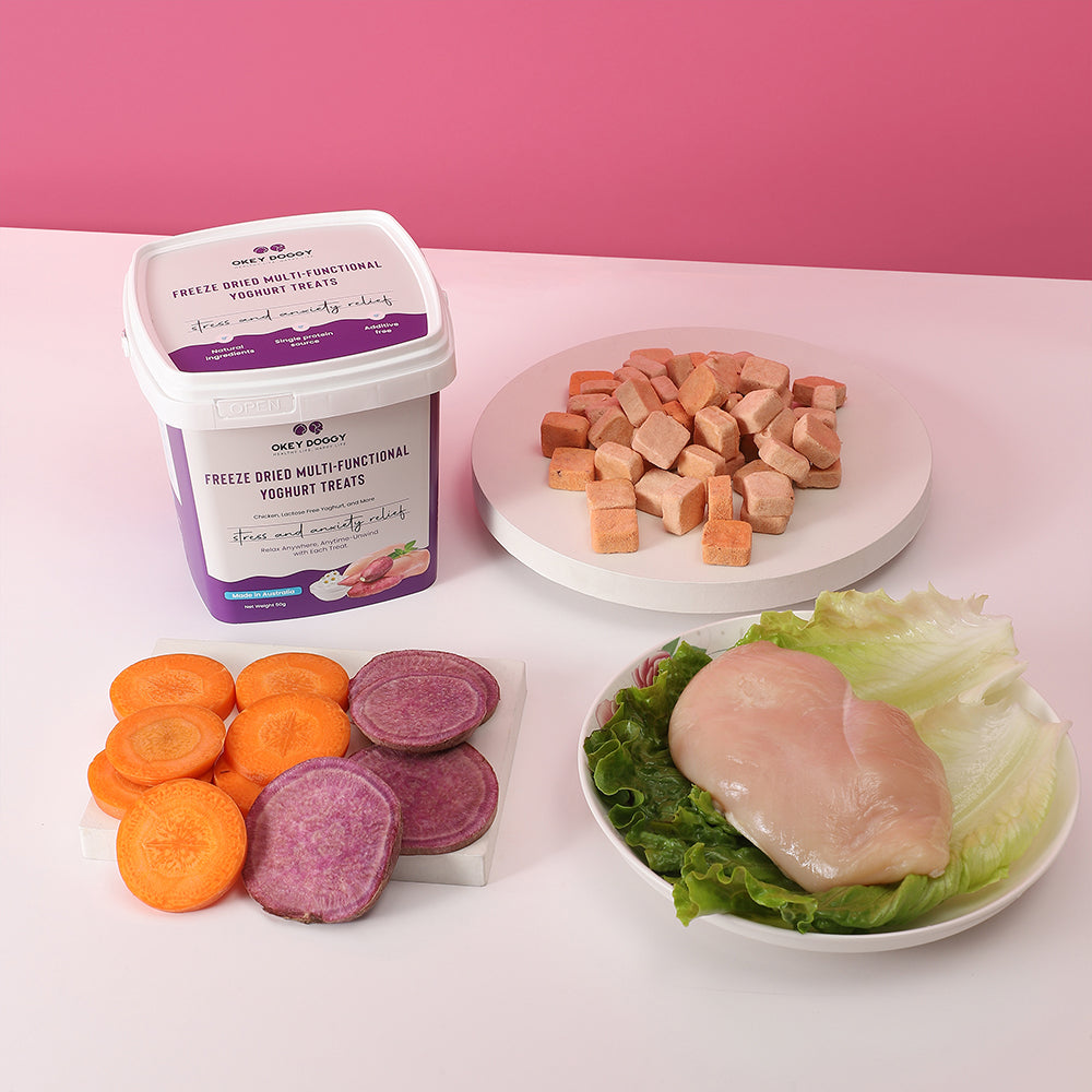 OKEY DOGGY Freeze Dried Stress & Anxiety Relief Multifunctional Yoghurt Pet Treats contain calming ingredients like chamomile, L-tryptophan, and jujube seed oil, which promote relaxation and reduce overreactions. Magnesium helps regulate mood by supporting neurotransmitter balance, while purple sweet potato and carrot provide essential nutrients for overall well-being. With a single protein source and lactose-free yogurt, these treats minimize allergy risks and are suitable for pets over 3 months old. This holistic blend helps pets feel calmer, supporting their mental health and emotional balance.
