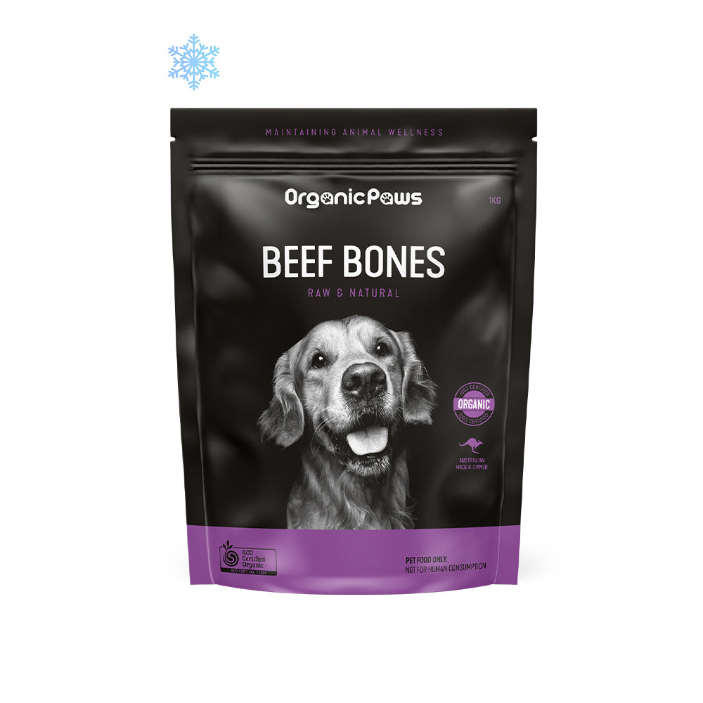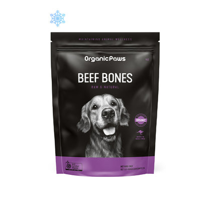 ORGANIC PAWS Beef Bones Raw Pet Food contains a variety of fresh, meaty bones, individually snap frozen for ease of use. These bones are a favorite treat for all dogs. Regularly feeding your dog these raw meaty bones, as part of a balanced raw diet, offers significant health benefits. They are an excellent source of Calcium and Phosphorus and help maintain dental health by acting like a toothbrush and floss, reducing tartar and the risk of gum disease. Additionally, chewing on raw bones provides mental stimulation and is a good workout for your dog's jaw muscles. Beef Bones are both a nutritious and enjoyable treat for dogs.