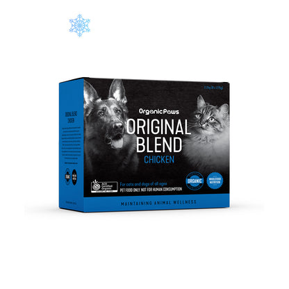 ORGANIC PAWS Original Blend Chicken Raw Pet Food includes quality chicken meat with breast, providing high protein. It features liver, rich in vitamin A, B vitamins, and essential minerals for skin, teeth, and eye health. Kidney and heart add more protein and are high in iron, B vitamins, and zinc. Green tripe offers probiotic benefits, essential nutrients, and fatty acids for gut health. Ground bone is a source of calcium for strong bones and joints. Cod liver oil, high in omega-3s, vitamins A and D, EPA, and DHA, supports overall health. Kelp contributes a range of vitamins and vital minerals, making this food nutritionally rich for pets.