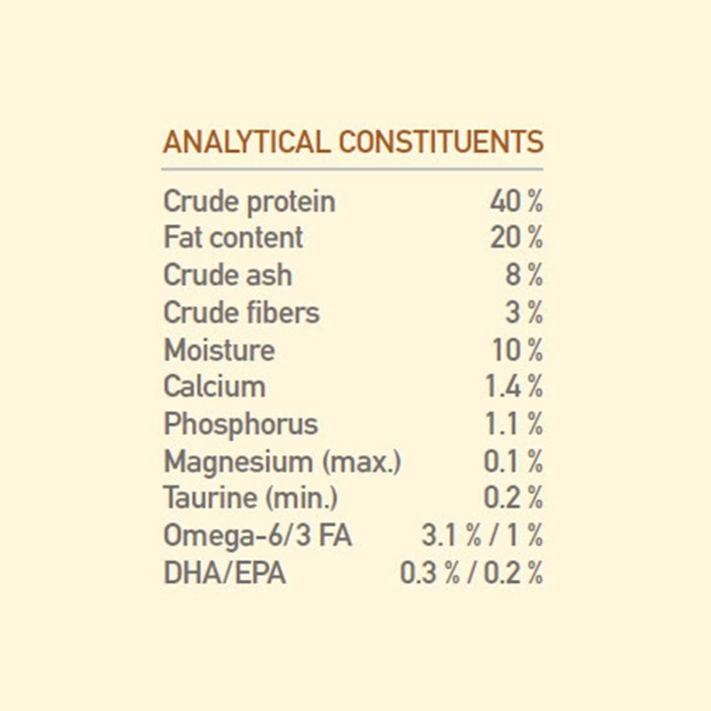 - 40% richly nourishing protein to nourish cats and kittens according to their evolutionary and biological needs.