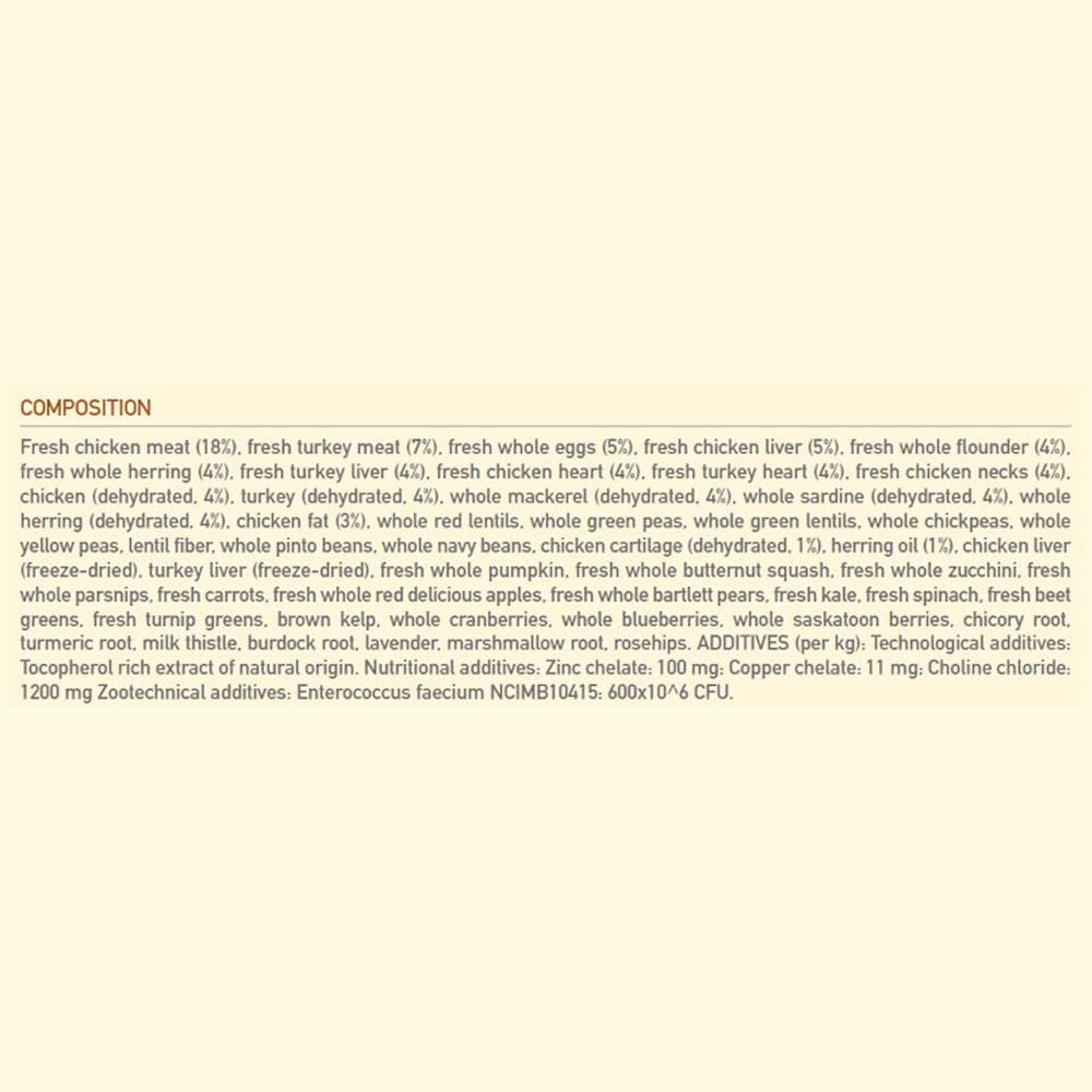 Chicken, turkey, whole herring, turkey giblets (liver, heart, gizzard), whole mackerel, dehydrated chicken, dehydrated turkey, dehydrated sardine, dehydrated herring, dehydrated chicken liver, dehydrated egg, whole red lentils, whole pinto beans, whole green peas, whole green lentils, whole chickpeas, natural chicken flavor, whole navy beans, whole white beans, pea starch, lentil fiber, chicken fat, choline chloride, whole cranberries, dried kelp, mixed tocopherols (preservative), whole pumpkin, whole butternut squash, collard greens, whole apples, whole pears, zinc proteinate, vitamin E supplement, thiamine mononitrate, copper proteinate, niacin, dried Bacillus coagulans fermentation product, dried chicory root, turmeric, sarsaparilla root, althea root, rosehips, juniper berries, citric acid (preservative), rosemary extract.