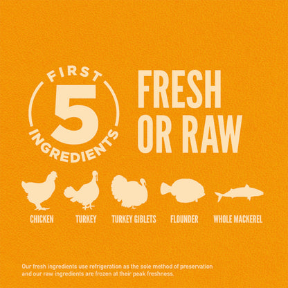 Deboned Chicken, Deboned Turkey, Yellowtail Flounder, Whole Eggs, Whole Atlantic Mackerel, Chicken Liver, Turkey Liver, Chicken Heart, Turkey Heart, Whole Atlantic Herring, Dehydrated Chicken, Dehydrated Turkey, Dehydrated Mackerel, Dehydrated Chicken Liver, Dehydrated Turkey Liver, Whole Green Peas, Whole Navy Beans, Red Lentils, Chicken Necks, Chicken Kidney, Chicken Fat, Pinto Beans, Chickpeas, Green Lentils, Natural Chicken Flavor, Lentil Fiber, Herring Oil, Ground Chicken Bone, Chicken Cartilage, Turkey Cartilage, Dried Kelp, Freeze-dried Chicken Liver, Freeze-dried Turkey Liver, Whole Pumpkin, Whole Butternut Squash, Kale, Spinach, Mustard Greens, Collard Greens, Turnip Greens, Whole Carrots, Apples, Pears, Pumpkin Seeds, Sunflower Seeds, Zinc Proteinate, Mixed Tocopherols (Preservative), Chicory Root, Turmeric, Sarsaparilla Root, Althea Root, Rosehips, Juniper Berries, Dried Lactobacillus Acidophilus Fermentation Product, Dried Bifidobacterium Animalis Fermentation Product, Dried Lactobacillus Casei Fermentation Product.