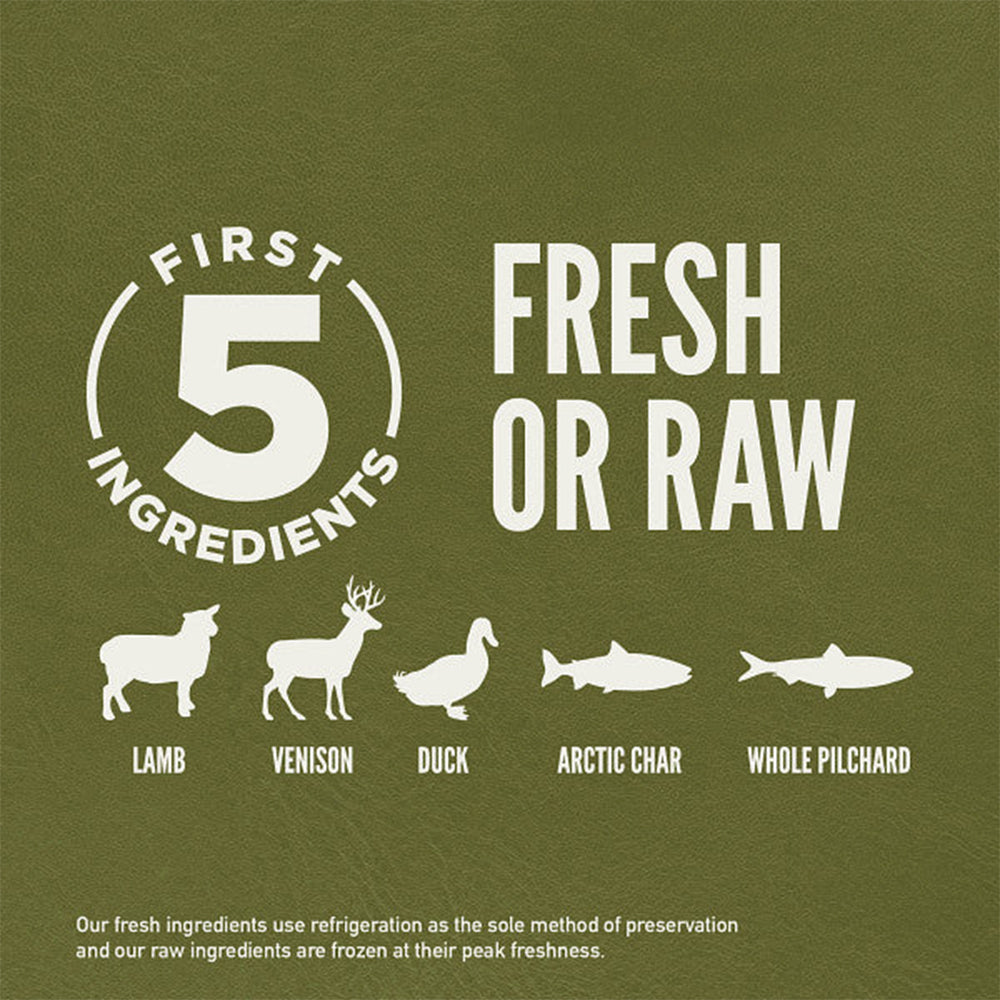 Lamb, venison, duck, arctic char, rainbow trout, lamb meal, pollock meal, sardine meal, herring meal, mackerel meal, whole red lentils, whole pinto beans, pork, pork fat, duck liver, natural pork flavor, pork liver, lamb liver, whole herring, pollock oil, whole navy beans, whole green lentils, whole chickpeas, whole peas, dried apple pomace, duck meal, lamb tripe, pork kidney, dried kelp, vitamin E supplement, zinc proteinate, whole butternut squash, whole pumpkin, mixed tocopherols (preservative), collard greens, whole pears, whole apples, niacin, thiamine mononitrate, calcium pantothenate, pyridoxine hydrochloride, riboflavin, folic acid, vitamin B12 supplement, copper proteinate, dried Bacillus coagulans fermentation product, dried chicory root, turmeric, sarsaparilla root, althea root, rosehips, juniper berries, citric acid (preservative), rosemary extract.