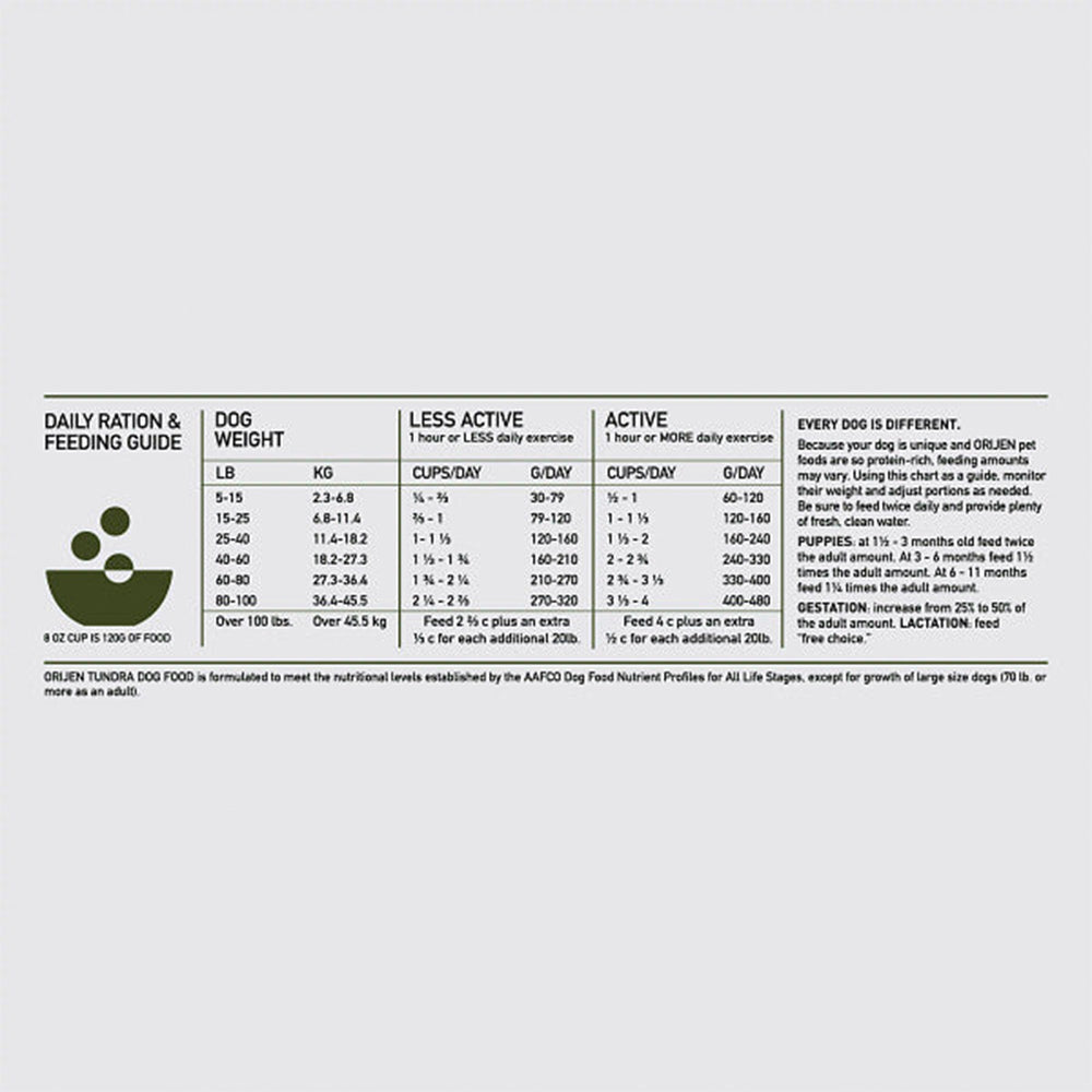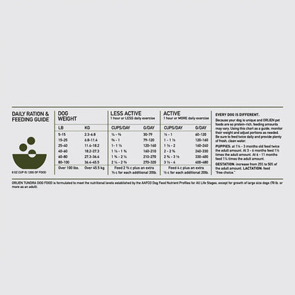 Help your dog thrive with the power of protein-rich recipes that provide peak nourishment. Dogs are ancestral carnivores, so their Biologically Appropriate diet is packed with fresh or raw animal ingredients. ORIJEN® Tundra diet provides your dog with a variety of nourishing animal protein they need to thrive from farm-raised lamb, and venison, duck, arctic char, rainbow trout, pork & whole herring. With inclusions of WholePrey animal ingredients, ORIJEN dog food is made with the most nutrient-dense, succulent parts of the prey to deliver the nutrition dogs need. The nourishing animal ingredients in our Tundra diet help support 3 key health benefits, including Immune Health, Skin & Coat Health, and Digestive Health.