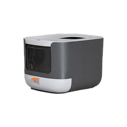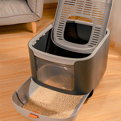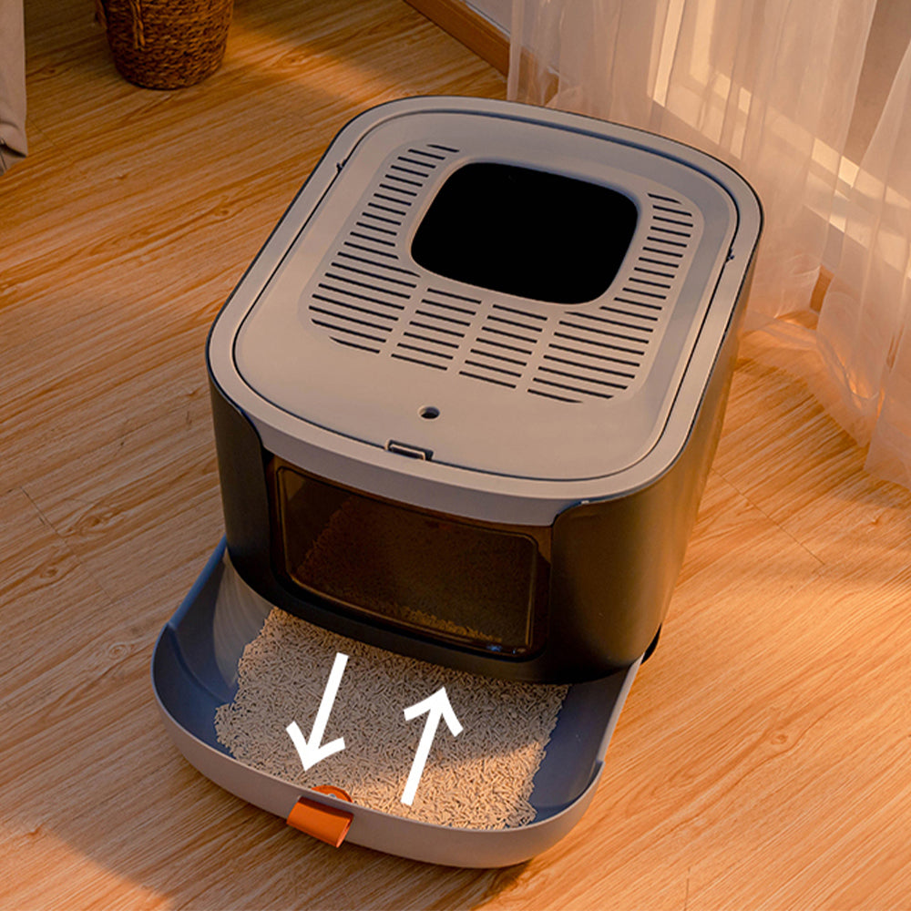 PAKEWAY Starry Valley Cat Litter Box - Grey offers spaciousness and anti-tracking features, with directional entry and a convenient sand drawer. It accommodates up to 30 pounds of litter, suitable even for larger cats. A large grid panel minimizes litter tracking, while its versatile design allows for both enclosed and open configurations with an easily removable panel for cleaning.
