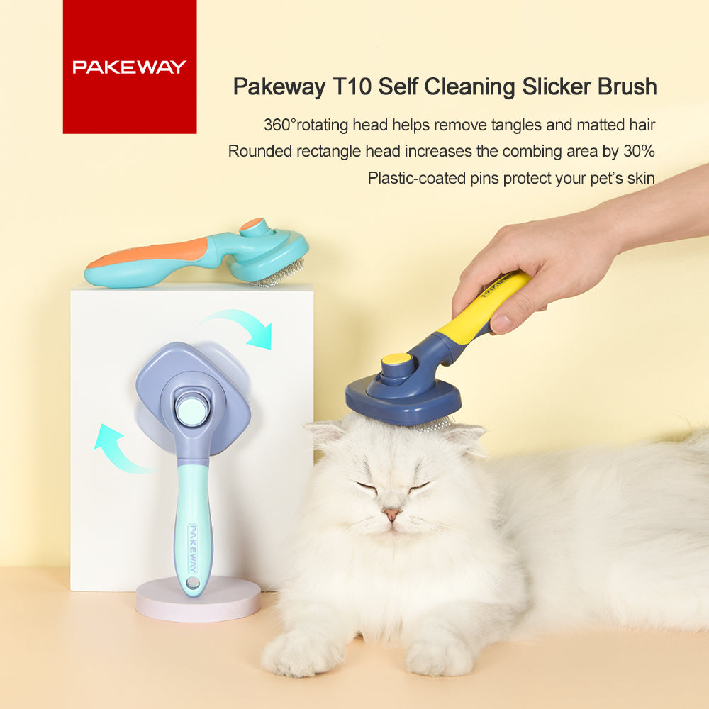 Does your pet shed A LOT? PAKEWAY Blue & Yellow T10 Self-Cleaning Slicker Brush Max (Extra Large) gently removes loose hair, and eliminates tangles, knots, dander and trapped dirt. The shedding brush works great on cats of all sizes and types of hair. The bristles are fine bent wires designed to penetrate deep into the coat and are able to groom the undercoat well without scratching your pet's skin! Great brush for dematting and shedding cats and dogs with long and short hair!
