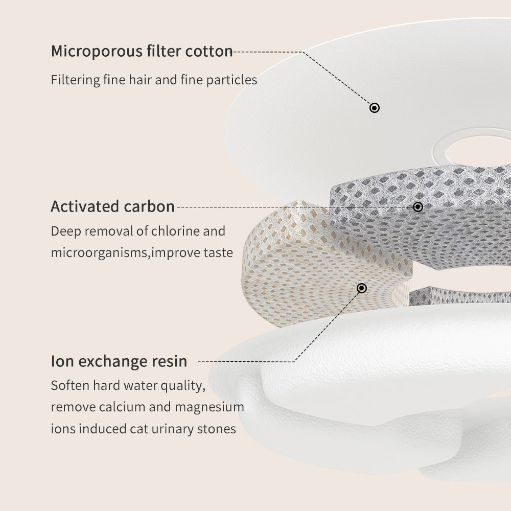 - Advanced Filtration System: The included π Series Drinking Fountain Filter uses a triple - filtration process. Composed of cotton, ion exchange resin, and activated carbon, it effectively filters out fine hair and particles, improves water taste by removing odors and chlorine, and softens water by reducing calcium and magnesium ions. This helps prevent urinary stones in pets and ensures they drink softened, purified water that's safe for straight consumption.