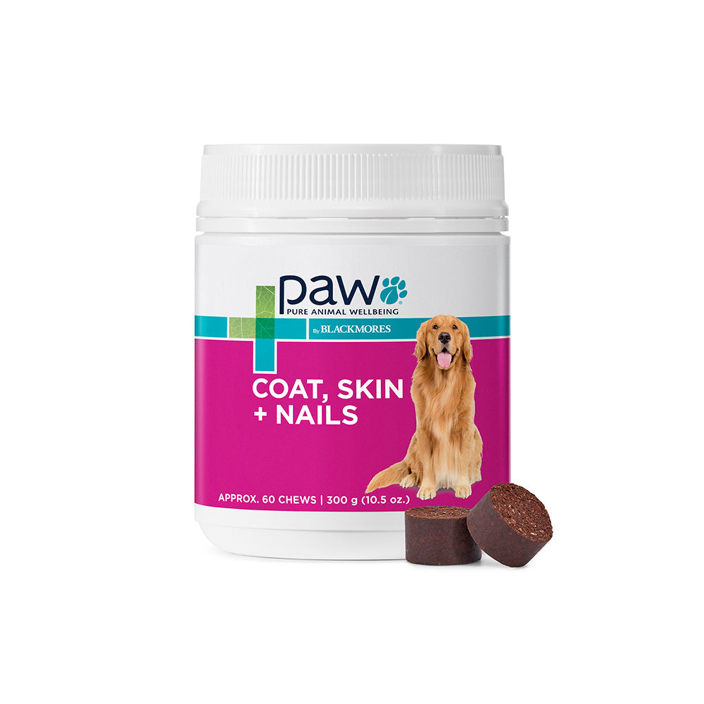PAW Dog Coat Skin & Nails Chews 300g are highly palatable low-fat kangaroo-based chews to help support healthy skin, a shiny coat and strong nails in your dog. It contains essential nutrients such as Biotin, Silica and Chia seeds to maintain healthy skin and coat.
