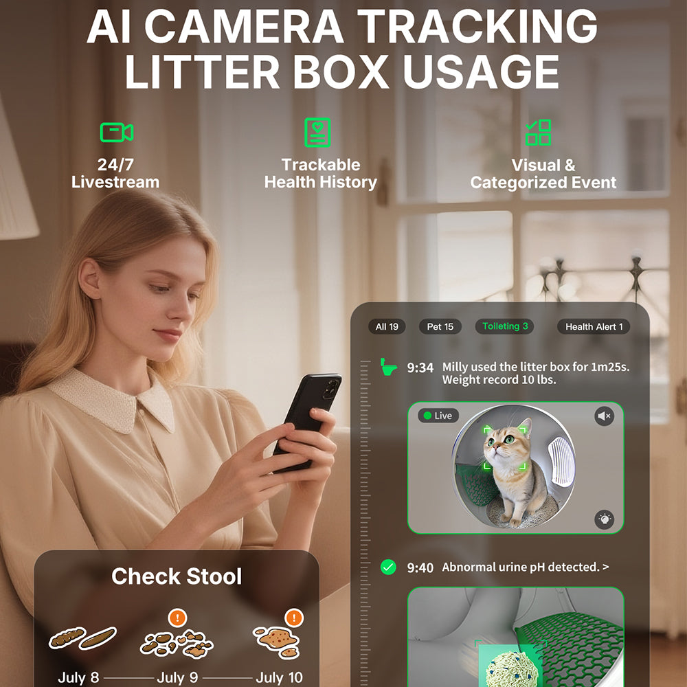 - Smart app control: cleaning cycles, litter level alerts, and health insights.