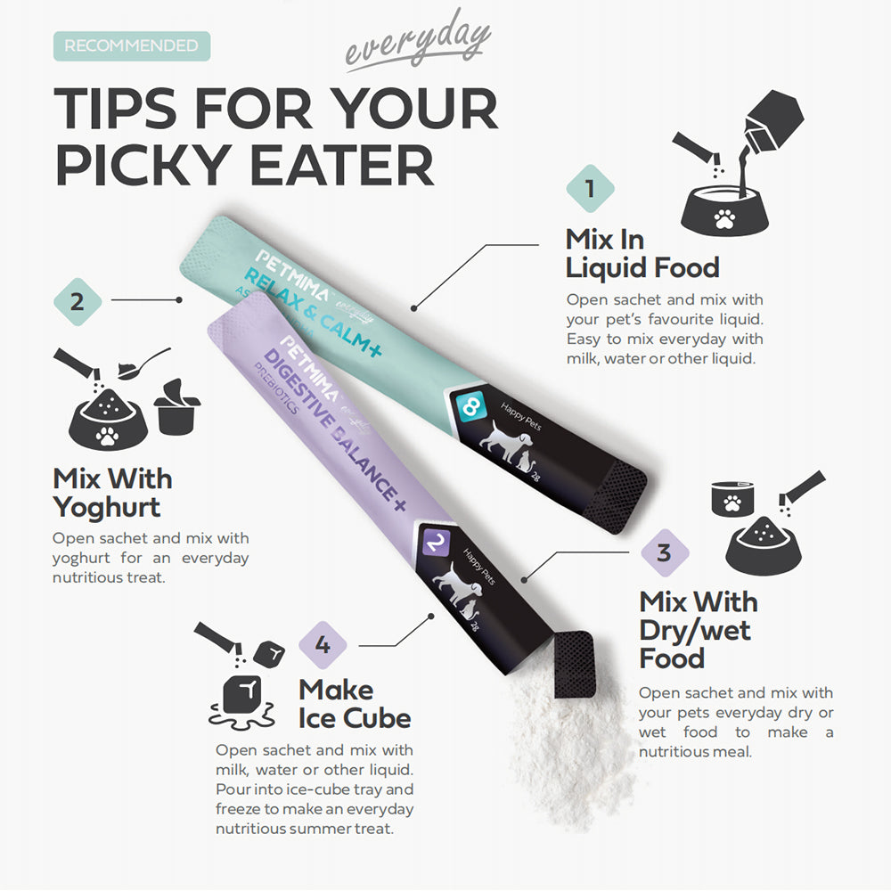 Add and mix recommended serving to your pet’s favourite dry, wet or liquid food.