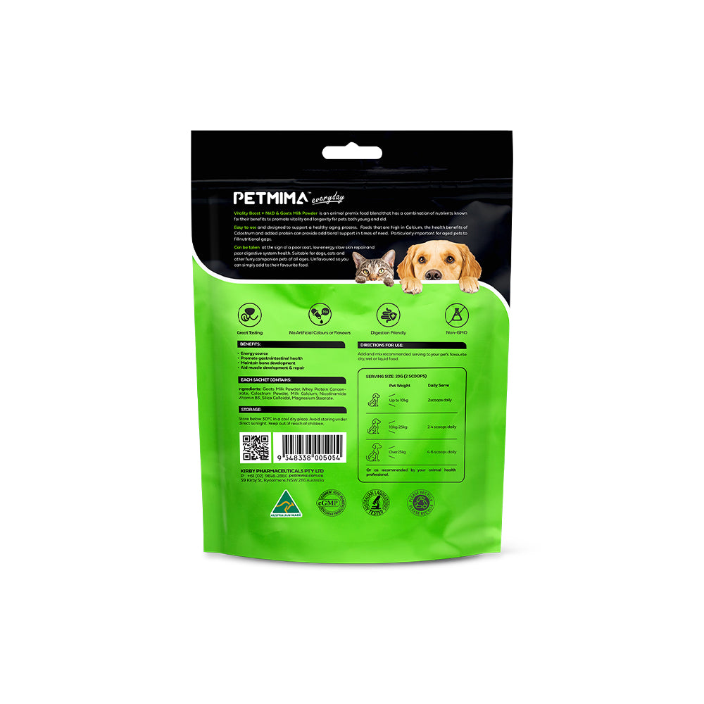 A combination of nutrients known for their benefits to promote vitality and longevity for pets both young and old. Nicotinamide provides energy and supports healthy cellular function and aids cell processes that are vital for the body to function normally. A balance of Colostrum, Goats Milk & Protein to provide additional support in times of need such as aged pets.