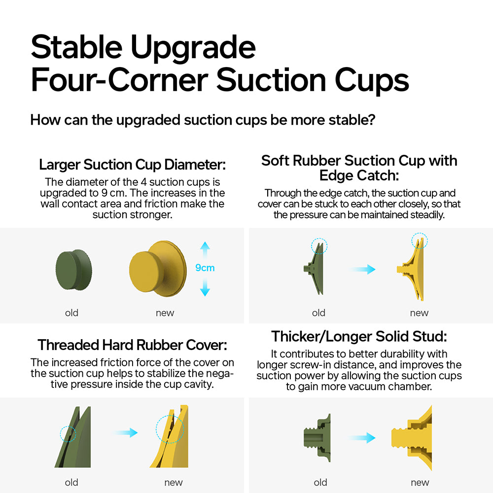 - Upgraded 9 cm suction cups provide increased wall contact area and friction, ensuring a stronger and more secure attachment.