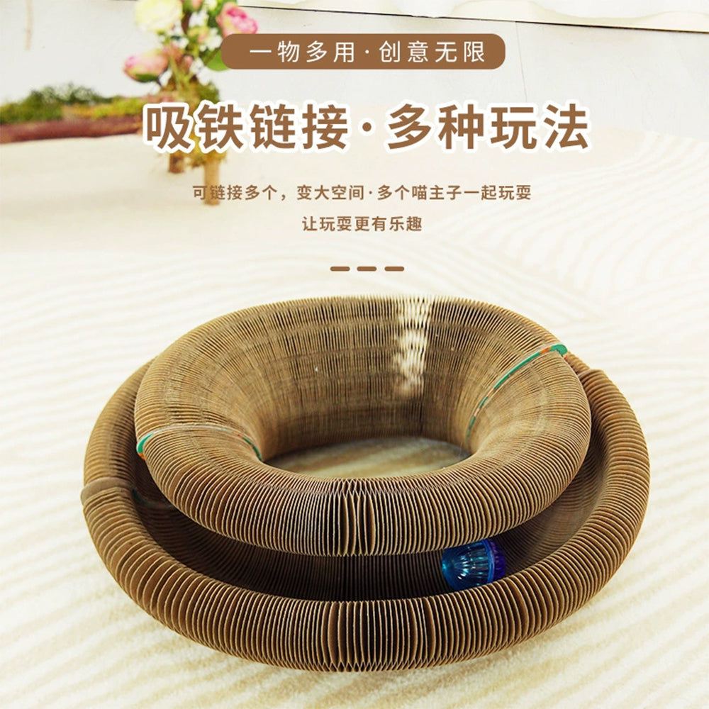 Transform your cat's scratching experience with this innovative pink foldable accordion cat scratcher. Featuring a unique magnetic design and premium corrugated cardboard, this versatile scratcher adjusts to multiple shapes and configurations, providing endless scratching possibilities while saving space in your home.