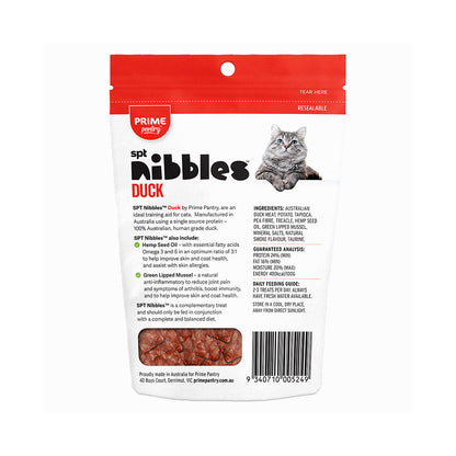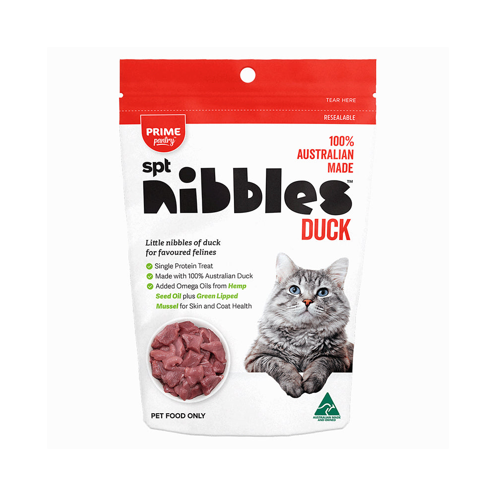 PRIME100 Pantry SPT Nibbles Duck Cat Training and Reward Treats 40g does not only taste yummy but also includes all the healthy ingredients cats need to be happy and healthy. Formulated for your feline friends to keep them active and inquisitive, helping them maintain a healthy weight while fighting allergies and other health problems.