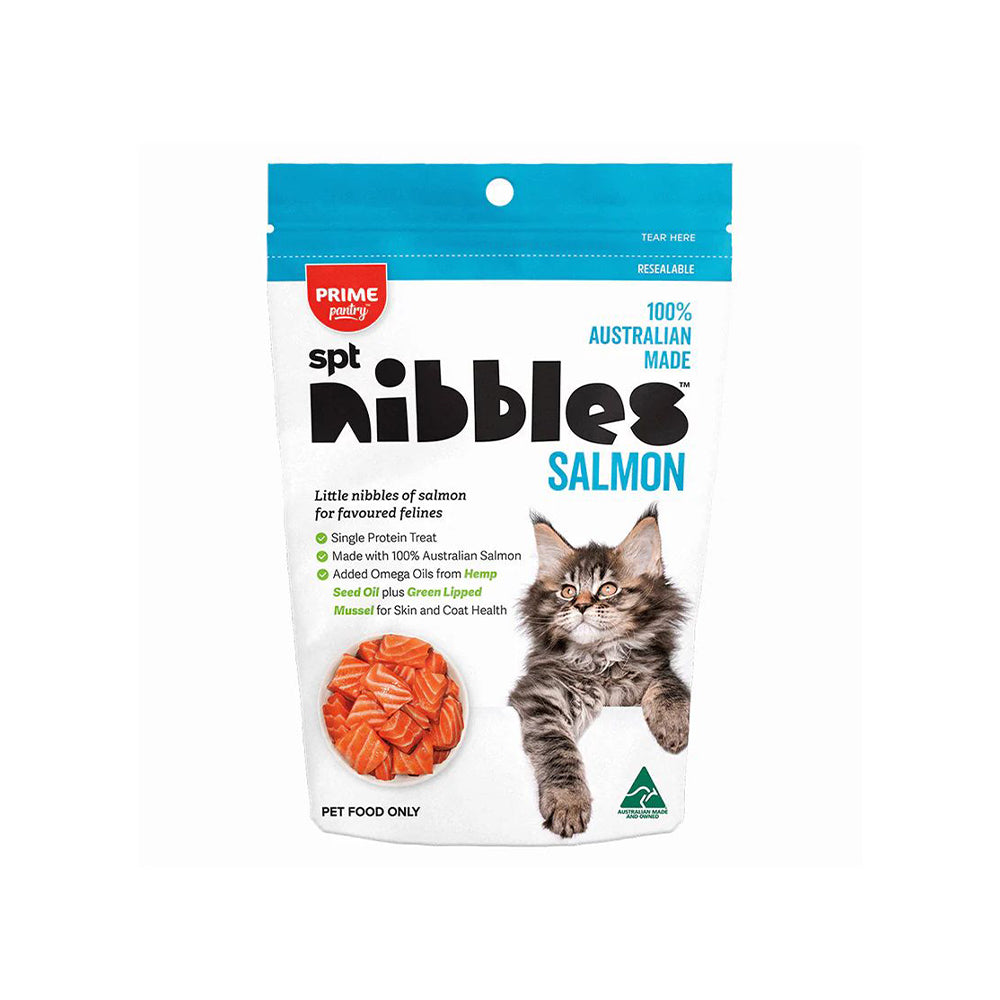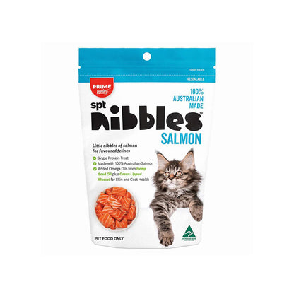 PRIME100 Pantry SPT Nibbles Salmon Cat Training and Reward Treats 40g is made with Aussie salmon, containing Omega 3 and 6 fatty acids for heart health. The no. 1 ingredient Salmon is locally and sustainably harvested by the most ethical methods possible and creates flavoursome nibbles that can be used as training treats without artificial tastes or meat byproduct contents that cause allergic reactions in cats of sensitive diets. Hemp seed oil formulation is added to improve skin and coat health while helping your purrfect furry friend to maintain a healthy weight with lean muscle mass. And lastly, these deliciously flavoured bites are infused with green-lipped mussel which supports joint function aiding feline seniors suffering from arthritis.