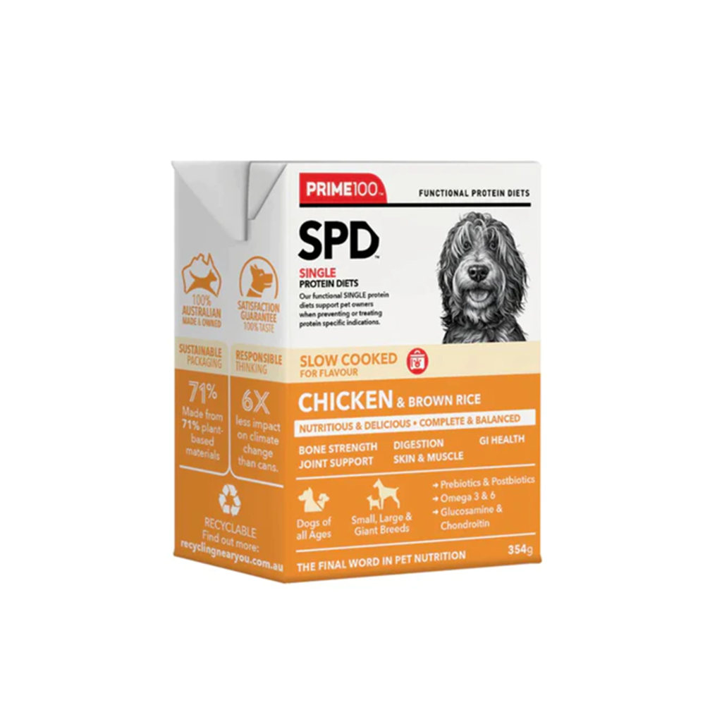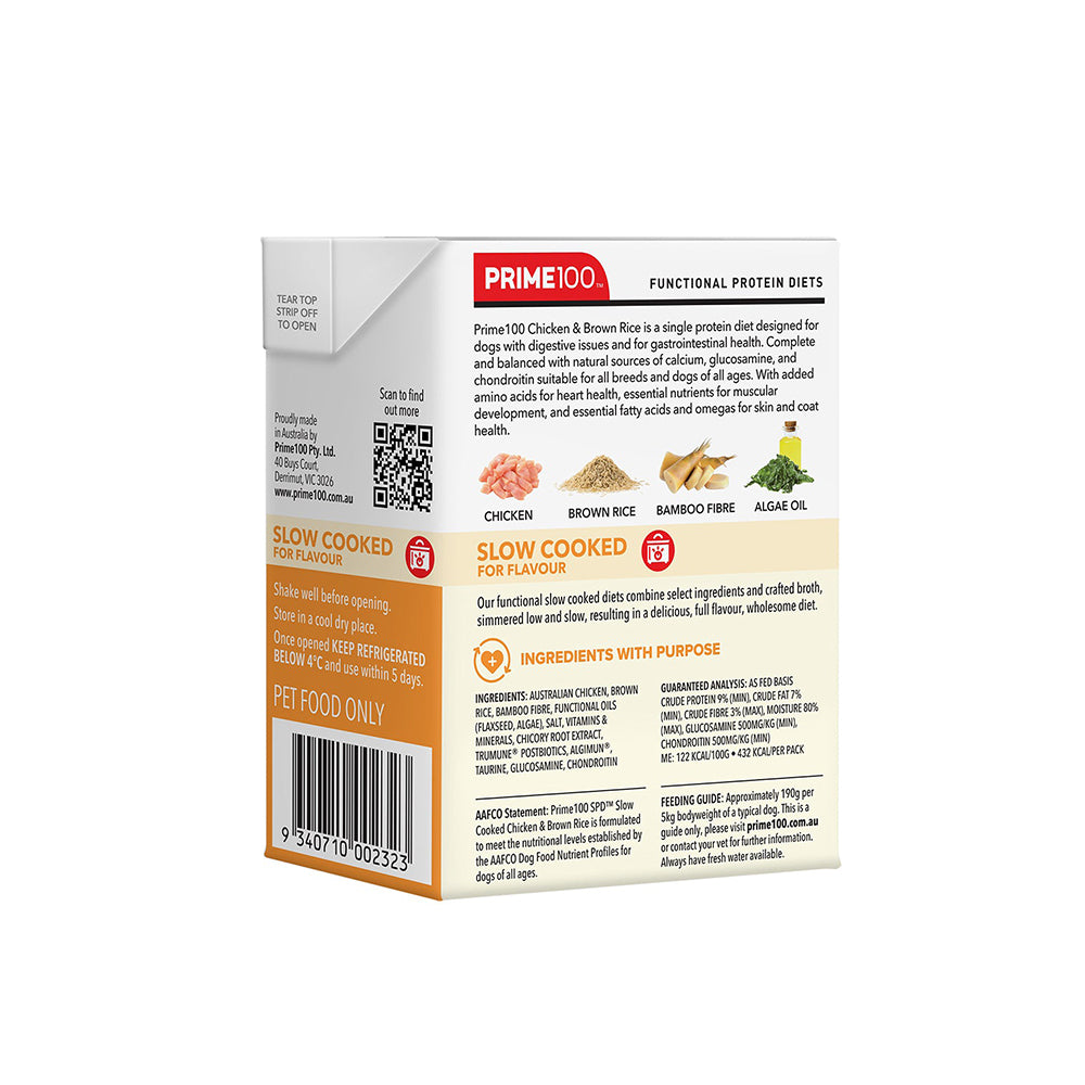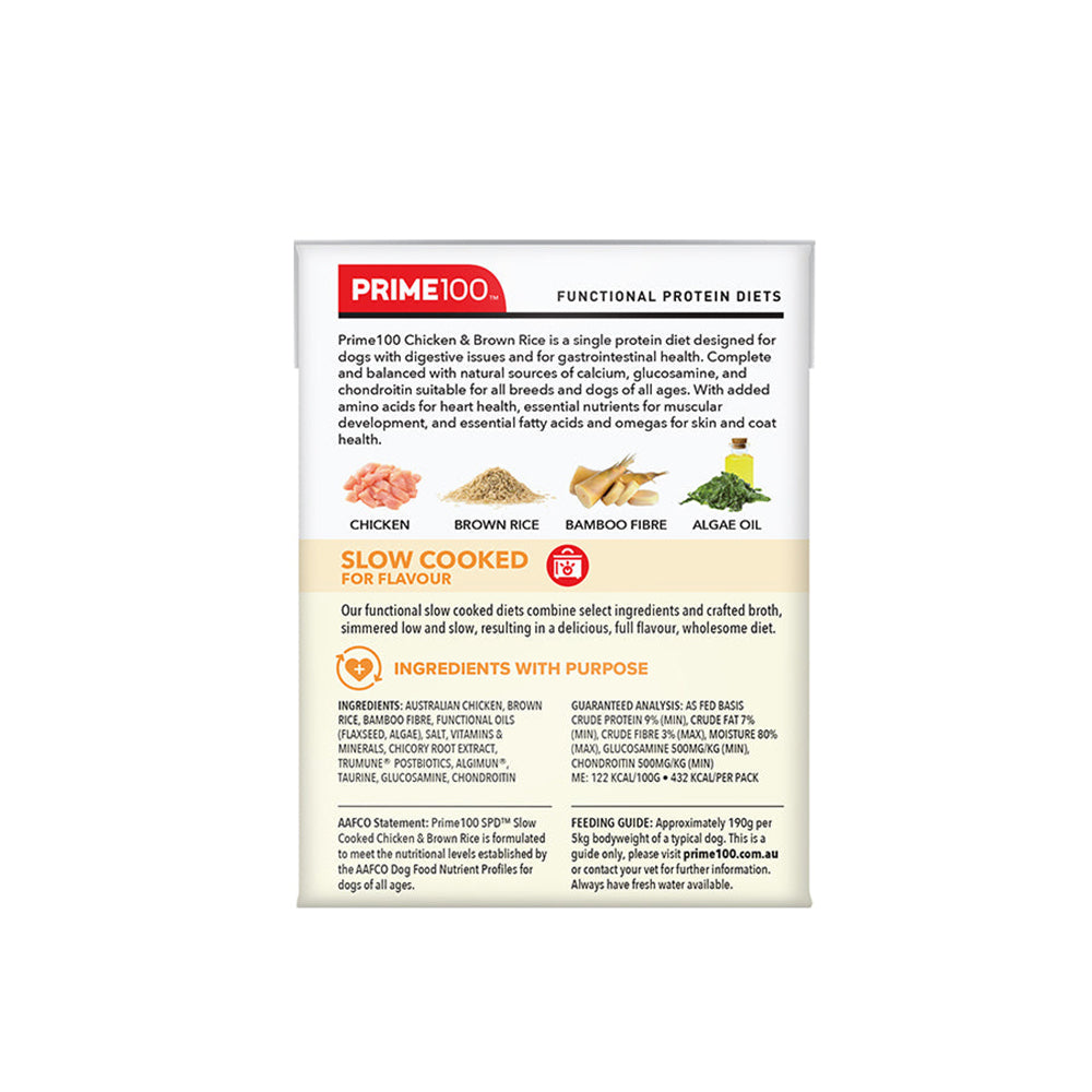 Prime100 SPD™ Slow Cooked Chicken & Brown Rice is a single protein diet designed for dogs with digestive issues and for gastrointestinal health. Complete and balanced with natural sources of calcium, glucosamine, and chondroitin for all breeds and dogs of all ages. With added amino acids for heart health, essential nutrients for muscular development, and essential fatty acids and omegas for skin and coat health.