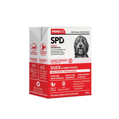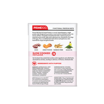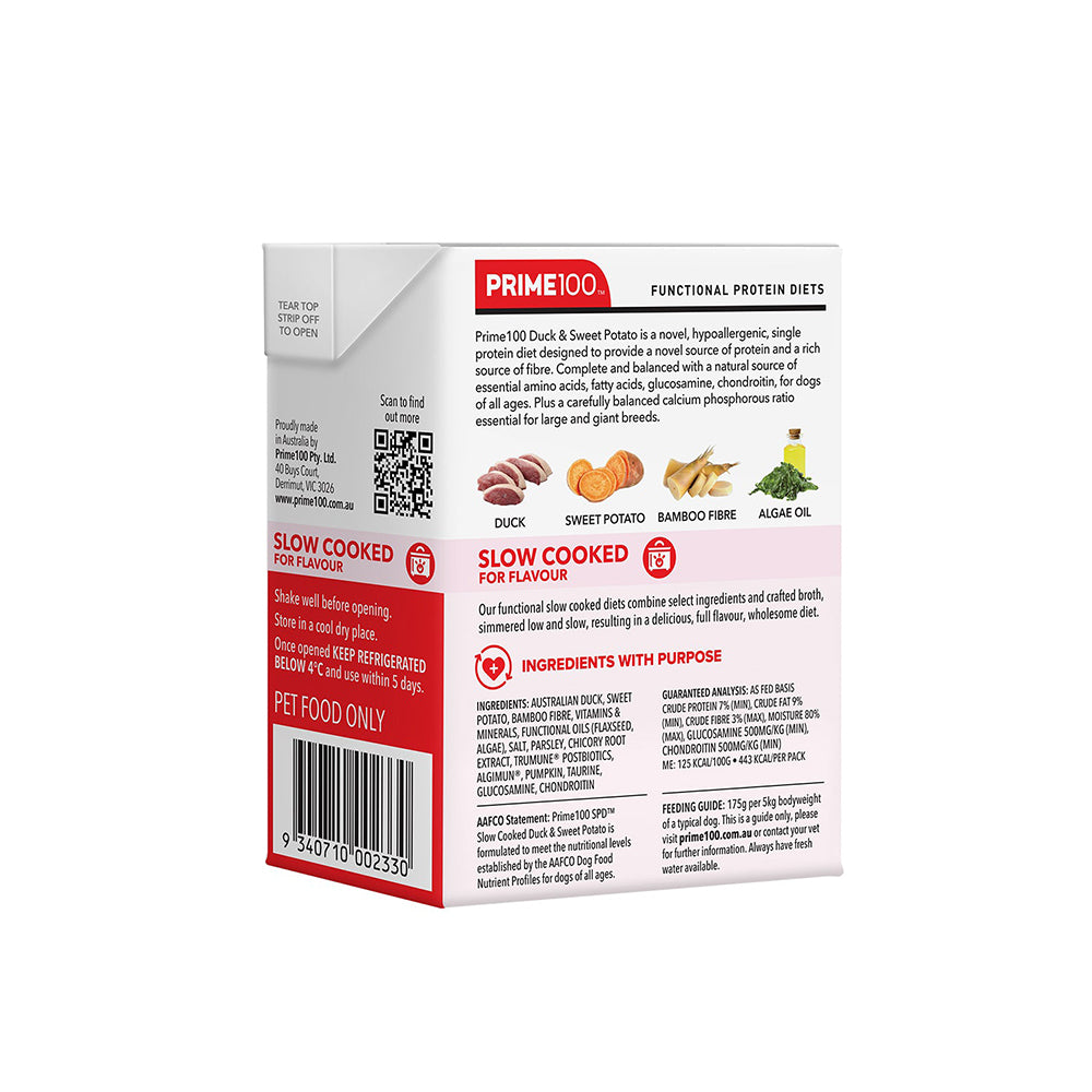 Prime100 SPD™ Slow Cooked Duck & Sweet Potato is a novel, hypoallergenic, single protein diet designed to provide a novel source of protein and a rich source of fibre. Complete and balanced with a natural source of essential amino acids, fatty acids, glucosamine, chondroitin, for dogs of all ages. Plus a carefully balanced calcium phosphorous ratio essential for large and giant breeds that is vet recommended.