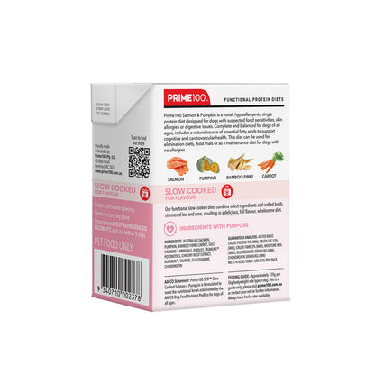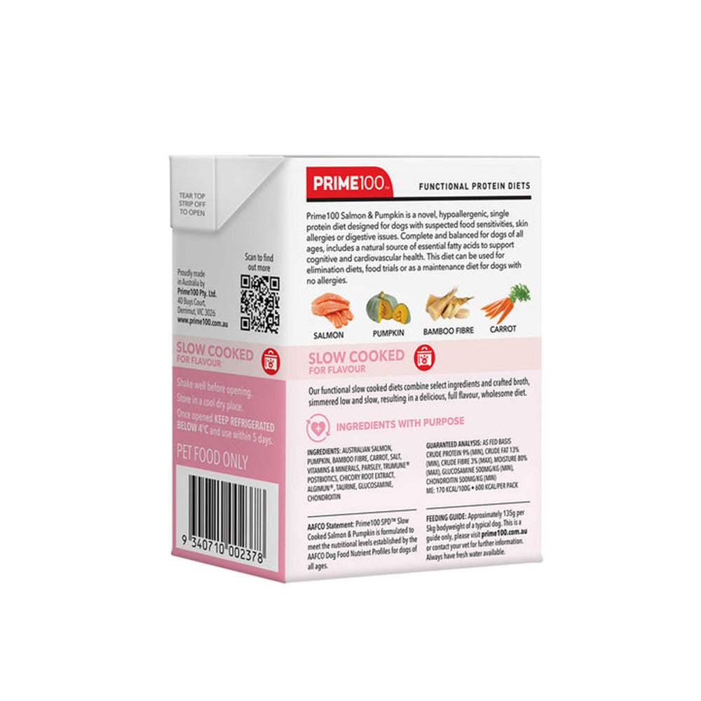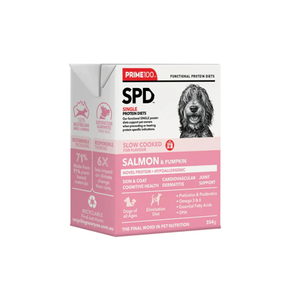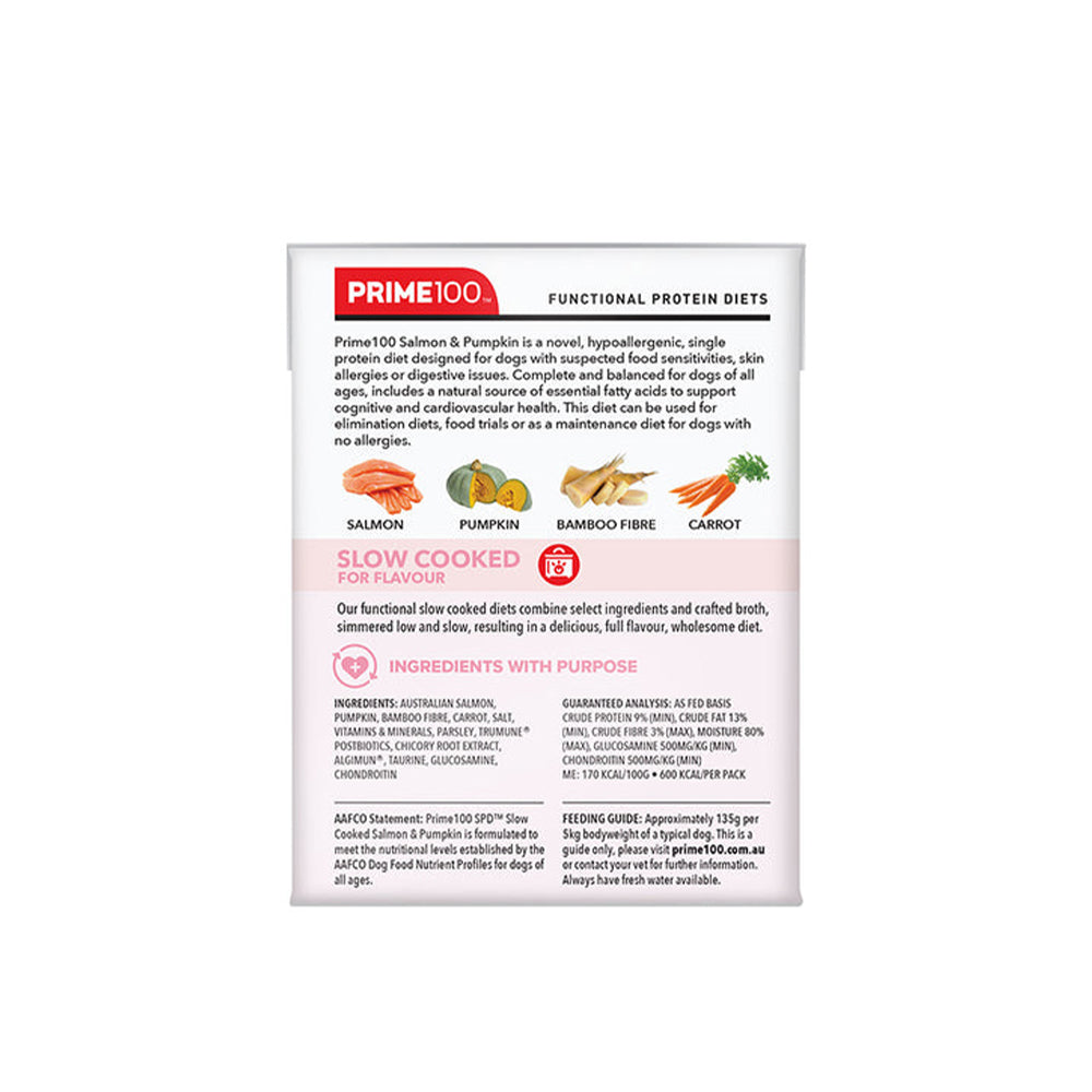 Prime100 SPD™ Slow Cooked Salmon & Pumpkin is a hypoallergenic diet designed for dogs with food sensitivities or allergies. It features a single protein source and is complete and balanced for dogs of all ages. Rich in essential fatty acids, it supports cognitive and cardiovascular health. This diet is ideal for elimination diets, food trials, or as a regular maintenance option for non-allergic dogs. Slow cooked for optimal flavor, it uses select ingredients and a crafted broth. The packaging is eco-friendly, made from 71% plant-based materials, and has minimal impact on climate change compared to cans.
