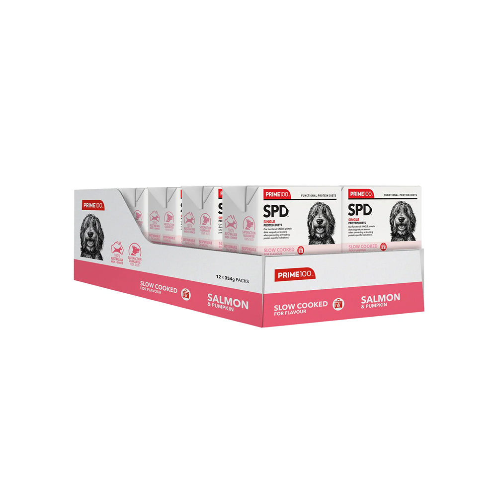Prime100 SPD™ Slow Cooked Salmon & Pumpkin is a hypoallergenic diet designed for dogs with food sensitivities or allergies. It features a single protein source and is complete and balanced for dogs of all ages. Rich in essential fatty acids, it supports cognitive and cardiovascular health. This diet is ideal for elimination diets, food trials, or as a regular maintenance option for non-allergic dogs. Slow cooked for optimal flavor, it uses select ingredients and a crafted broth. The packaging is eco-friendly, made from 71% plant-based materials, and has minimal impact on climate change compared to cans.